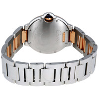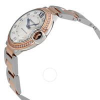 Stainless steel case with a stainless steel bracelet with 18kt rose gold links. Fixed 18kt rose gold bezel set with diamonds. Silver dial with blued-steel sword-shaped hands and diamond hour markers. A Roman numeral appears at the 12 o'clock position. Minute markers around an inner ring. Dial Type: Analog. Cartier calibre 076 automatic movement, based upon ETA 2670, containing 25 Jewels, bitting at 28800 vph, and has a power reserve of approximately 38 hours. Scratch resistant sapphire crystal. Solid case back. Round case shape. Case size: 36 mm. Case thickness: 12.05 mm. Deployment clasp. Water resistant at 30 meters / 100 feet. Functions: hour, minute. Additional Info: bezel set with 58 brilliant-cut diamonds (0.73 carats), crown set with a synthetic cabochon-shaped spinel. Ballon Bleu Series. Luxury watch style. Watch label: Swiss Made. Cartier Ballon Bleu Automatic Silver Dial Ladies Watch W3BB0004. INFORMATION Brand: Cartier Series: Ballon Bleu De Cartier Collection Name: Ballon Bleu de Cartier Gender: Womens Model: W3BB0004 Watch Label: Swiss Made Movement: Automatic Engine: Cartier Calibre 076 Power Reserve: 38 hours CASE Case Size: 36 mm Case Thickness: 12.05 mm Case Material: Stainless Steel Case Shape: Round Case Back: Solid BAND Band Material: Stainless Steel with 18kt Rose Gold Band Type: Bracelet Band Color: Silver-tone Clasp: Deployment DIAL Dial Color: Silver Type: Analog Crystal: Scratch Resistant Sapphire Hands: Blued-steel Sword-shaped Dial Markers: Diamond Second Markers: Roman Numeral appears at the 12 o'clock position. Minute Markers around an inner ring Bezel: Fixed Bezel Color: 18kt Rose Bezel Material: 18kt Rose Gold set with Diamonds Crown: Pull / Push FEATURES Water Resistance: 30 meters / 100 feet Functions: Hour, Minute Watch Features: Diamond, Stainless Steel, Gold, Analog ADDITIONAL INFO Watch Style: Luxury Warranty: 2 Year Jomashop Warranty UPC Code: 7613268645468 Additional Info: bezel set with 58 brilliant-cut diamonds (0.73 carats), crown set with a synthetic cabochon-shaped spinel Jomashop Sku: CRTW3BB0004 Department: Watches Category: Watches
