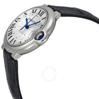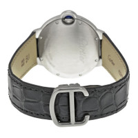 Stainless steel case with a black (alligator) leather strap. Fixed stainless steel bezel. Silver opaline dial with blued-steel sword-shaped hands and Roman numeral hour markers. Minute markers around an inner ring. Dial Type: Analog. Cartier calibre 076 automatic movement, based upon ETA 2670, containing 25 Jewels, bitting at 28800 vph, and has a power reserve of approximately 38 hours. Scratch resistant sapphire crystal. Fluted push / pull crown set with a spinel cabochon. Solid case back. Round case shape. Case size: 36.6 mm. Case thickness: 12.05 mm. Band width: 20 mm. Deployment fold over clasp. Water resistant at 30 meters / 100 feet. Functions: hour, minute, second. Ballon Bleu De Cartier Series. Luxury watch style. Watch label: Swiss Made. Cartier Ballon Bleu Automatic Silver Dial Ladies Watch W69017Z4. GENERAL Color: Black / Blue / Silver INFORMATION Brand: Cartier Series: Ballon Bleu De Cartier Collection Name: Ballon Bleu de Cartier Gender: Womens Model: W69017Z4 Watch Label: Swiss Made Movement: Automatic Engine: Cartier Calibre 076 Power Reserve: 38 hours CASE Case Size: 36.6 mm Case Thickness: 12.05 mm Case Material: Stainless Steel Case Shape: Round Case Back: Solid BAND Band Material: (Alligator) Leather Band Type: Strap Band Color: Black Band Width: 20 mm Clasp: Deployment Fold Over DIAL Dial Color: Silver Opaline Type: Analog Crystal: Scratch Resistant Sapphire Hands: Blued-steel Sword-shaped Dial Markers: Roman Numeral Second Markers: Minute Markers around an inner ring Bezel: Fixed Bezel Color: Silver-tone Bezel Material: Stainless Steel Crown: Fluted Push / Pull set with Spinel Cabochon FEATURES Water Resistance: 30 meters / 100 feet Functions: Hour, Minute, Second Watch Features: Stainless Steel, Leather, Analog, Alligator Leather ADDITIONAL INFO Watch Style: Luxury Warranty: 2 Year Jomashop Warranty UPC Code: 7612456383298 Jomashop Sku: CRTW69017Z4 Department: Watches Category: Watches