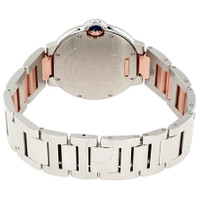 Stainless steel case with a two-tone (silver-tone and pink gold-tone) stainless steel and 18kt pink gold bracelet. Fixed 18kt pink gold bezel. Silver dial with blued-steel sword-shaped hands and diamond hour markers. Roman numeral appears at the 12 o'clock position. minute markers around an inner ring. Dial Type: Analog. Cartier Calibre 076 Automatic movement, based upon ETA 2670, containing 25 Jewels, bitting at 28800 vph, and has a power reserve of approximately 38 hours. Scratch resistant sapphire crystal. Pull / push crown. Solid case back. Round case shape. Case size: 36 mm. Band width: 17.5 mm. Deployment clasp. Water resistant at 30 meters / 100 feet. Functions: hour, minute. Luxury watch style. Watch label: Swiss Made. Cartier Ballon Bleu Automatic Silver Diamond Dial Steel and 18K Pink Gold Ladies Watch W3BB0007. CASE Case Size: 36 mm Case Material: Stainless Steel Case Shape: Round Case Back: Solid BAND Band Material: Stainless Steel and 18kt Pink Gold Band Type: Bracelet Band Color: Two-tone (Silver-tone and Pink Gold-tone) Band Width: 17.5 mm Clasp: Deployment DIAL Dial Color: Silver Type: Analog Crystal: Scratch Resistant Sapphire Hands: Blued-steel Sword-shaped Dial Markers: Diamond Second Markers: Roman Numeral appears at the 12 o'clock position. Minute Markers around an inner ring Bezel: Fixed Bezel Material: 18kt Pink Gold Crown: Pull / Push INFORMATION Brand: Cartier Series: Ballon Bleu De Cartier Collection Name: Ballon Bleu de Cartier Gender: Womens Model: W3BB0007 Watch Label: Swiss Made Movement: Automatic Engine: Cartier Calibre 076 Power Reserve: 38 hours FEATURES Water Resistance: 30 meters / 100 feet Functions: Hour, Minute Watch Features: Analog, Gold, Stainless Steel, Diamond ADDITIONAL INFO Watch Style: Luxury Warranty: 2 Year Jomashop Warranty UPC Code: 7613268534472 Jomashop Sku: CRTW3BB0007 Department: Watches Category: Watches