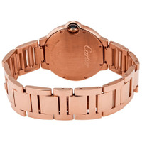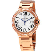18kt pink gold case with a 18kt pink gold bracelet. Fixed 18kt pink gold bezel set with diamonds. Silver dial with blued-steel sword-shaped hands and Roman numeral hour markers. Minute markers around an inner ring. Dial Type: Analog. Automatic movement. Scratch resistant sapphire crystal. Fluted push / pull set with a sapphire cabochon. Solid case back. Round case shape. Case size: 36 mm. Case thickness: 12.1 mm. Hidden fold over clasp. Water resistant at 30 meters / 100 feet. Functions: hour, minute, second. Ballon Bleu De Cartier Series. Luxury watch style. Watch label: Swiss Made. Cartier Ballon Bleu De Cartier Automatic Diamond Silver Dial Ladies Watch WJBB0037. INFORMATION Brand: Cartier Series: Ballon Bleu De Cartier Collection Name: Ballon Bleu De Cartier Gender: Womens Model: WJBB0037 Watch Label: Swiss Made Movement: Automatic CASE Case Size: 36 mm Case Thickness: 12.1 mm Case Material: 18kt Pink Gold Case Shape: Round Case Back: Solid BAND Band Material: 18kt Pink Gold Band Type: Bracelet Band Color: Pink Gold Clasp: Hidden Fold Over DIAL Dial Color: Silver Type: Analog Crystal: Scratch Resistant Sapphire Hands: Blued-steel Sword-shaped Dial Markers: Roman Numeral Second Markers: Minute Markers around an inner ring Bezel: Fixed Bezel Color: 18kt Pink Gold Bezel Material: 18kt Pink Gold set with Diamonds Crown: Fluted Push / Pull set with a Sapphire Cabochon FEATURES Water Resistance: 30 meters / 100 feet Functions: Hour, Minute, Second Watch Features: Diamond, Gold, Analog ADDITIONAL INFO Watch Style: Luxury Warranty: 2 Year Jomashop Warranty Jomashop Sku: CRTWJBB0037 Department: Watches Category: Watches