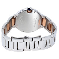 Stainless steel case with a stainless steel bracelet with 18kt rose gold links. Fixed 18kt rose gold bezel. Guilloche dial with blued-steel sword-shaped hands and Roman numeral hour markers. Minute markers around an inner ring. Dial Type: Analog. Date display at the 3 o'clock position. Cartier calibre 1847 MC automatic movement, containing 23 Jewels, bitting at 28800 vph, and has a power reserve of approximately 42 hours. Scratch resistant sapphire crystal. Pull / push crown. Solid case back. Round case shape. Case size: 42 mm. Case thickness: 13 mm. Hidden fold over clasp. Water resistant at 30 meters / 100 feet. Functions: date, hour, minute, second. Additional Info: crown set with a synthetic cabochon-shaped spinel. Ballon Bleu De Cartier Series. Luxury watch style. Watch label: Swiss Made. Cartier Ballon Bleu De Cartier Guilloche Dial Automatic Men's Watch W2BB0004. CASE Case Size: 42 Case Thickness: 13 mm Case Material: Stainless Steel Case Shape: Round Case Back: Solid BAND Band Material: Stainless Steel with 18kt Rose Gold Band Type: Bracelet Band Color: Silver-tone Clasp: Hidden Fold Over DIAL Dial Color: Guilloche Type: Analog Crystal: Scratch Resistant Sapphire Hands: Blued-steel Sword-shaped Dial Markers: Roman Numeral Second Markers: Minute Markers around an inner ring Bezel: Fixed Bezel Material: 18kt Rose Gold Crown: Pull / Push INFORMATION Brand: Cartier Series: Ballon Bleu De Cartier Collection Name: Ballon Bleu De Cartier Gender: Mens Model: W2BB0004 Watch Label: Swiss Made Movement: Automatic Engine: Cartier Calibre 1847 MC Power Reserve: 42 hours FEATURES Water Resistance: 30 meters / 100 feet Calendar: Date display at the 3 o'clock position Functions: Date, Hour, Minute, Second Watch Features: Stainless Steel, Gold, Analog ADDITIONAL INFO Watch Style: Luxury Warranty: 2 Year Jomashop Warranty UPC Code: 7613268645437 Additional Info: crown set with a synthetic cabochon-shaped spinel Jomashop Sku: CRTW2BB0004 Department: Watches Category: Watches