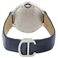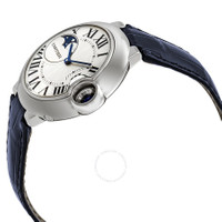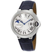 Stainless steel case with a blue (alligator) leather strap. Fixed silver-tone stainless steel bezel. Silver dial with blued-steel sword-shaped hands and Roman numeral hour markers. Minute markers around an inner ring. Dial Type: Analog. Moonphase display. Automatic movement. Scratch resistant sapphire crystal. Solid case back. Round case shape. Case size: 37 mm. Case thickness: 13 mm. Fold over buckle clasp. Water resistant at 30 meters / 100 feet. Functions: hour, minute, moonphase. Ballon Bleu Series. Luxury watch style. Watch label: Swiss Made. Cartier Ballon Bleu Moonphase Automatic Silver Dial Ladies Watch WSBB0020. INFORMATION Brand: Cartier Series: Ballon Bleu De Cartier Collection Name: Ballon Bleu de Cartier Gender: Womens Model: WSBB0020 Watch Label: Swiss Made Movement: Automatic CASE Case Size: 37 mm Case Thickness: 13 mm Case Material: Stainless Steel Case Shape: Round Case Back: Solid BAND Band Material: (Alligator) Leather Band Type: Strap Band Color: Blue Clasp: Fold Over Buckle DIAL Dial Color: Silver Type: Analog Crystal: Scratch Resistant Sapphire Hands: Blued-steel Sword-shaped Dial Markers: Roman Numeral Second Markers: Minute Markers around an inner ring Sub Dials: Moonphase Bezel: Fixed Bezel Color: Silver-tone Bezel Material: Stainless Steel FEATURES Water Resistance: 30 meters / 100 feet Functions: Hour, Minute, Moonphase Watch Features: Stainless Steel, Leather, Analog, Alligator Leather ADDITIONAL INFO Watch Style: Luxury Warranty: 2 Year Jomashop Warranty UPC Code: 7613268812679 Jomashop Sku: CRTWSBB0020 Department: Watches Category: Watches