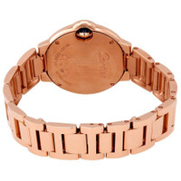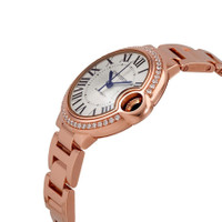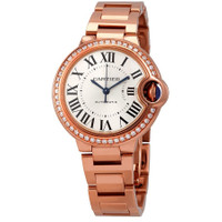 18kt rose gold case and bracelet. Fixed 18kt rose gold bezel set with diamonds. Silver dial with blued-steel sword-shaped hands and black Roman numeral hour markers. Minute scale around aninner ring. Dial Type: Analog. Automatic movement. Scratch resistant sapphire crystal. Fluted crown. Solid case back. Round case shape. Case size: 33 mm. case thickness: 10 mm. Hidden fold over clasp. Water resistant at 30 meters / 100 feet. Functions: hour, minute, second. Additional Info: fluted crown set with a sapphire cabochon. Ballon Bleu Series. Luxury watch style. Watch label: Swiss Made. Cartier Ballon Bleu Silver Dial Automatic Ladies 18kt Rose Gold Diamond Watch WJBB0036. INFORMATION Brand: Cartier Series: Ballon Bleu De Cartier Collection Name: Ballon Bleu de Cartier Gender: Womens Model: WJBB0036 Watch Label: Swiss Made Movement: Automatic CASE Case Size: 33 mm Case Thickness: 10 mm Case Material: 18kt Rose Gold Case Shape: Round Case Back: Solid BAND Band Material: 18kt Rose Gold Band Type: Bracelet Clasp: Hidden Fold Over DIAL Dial Color: Silver Type: Analog Crystal: Scratch Resistant Sapphire Hands: Blued-steel Sword-shaped Dial Markers: Black Roman Numeral Second Markers: Minute Scale around aninner ring Bezel: Fixed Bezel Color: 18kt Rose Gold Bezel Material: 18kt Rose Gold set with Diamonds Crown: Fluted FEATURES Water Resistance: 30 meters / 100 feet Functions: Hour, Minute, Second Watch Features: Diamond, Gold, Analog ADDITIONAL INFO Watch Style: Luxury Warranty: 2 Year Jomashop Warranty UPC Code: 7613268990018 Additional Info: Fluted crown set with a sapphire cabochon Jomashop Sku: CRTWJBB0036 Department: Watches Category: Watches