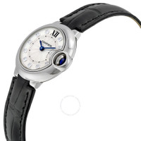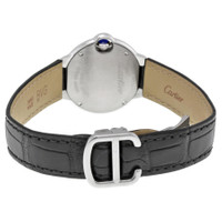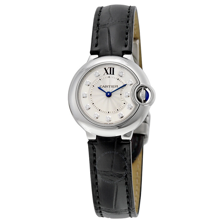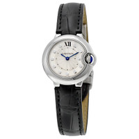 Stainless steel case with a black alligator leather strap. Fixed stainless steel bezel. Silver dial with blue hands and diamond hour markers. A Roman numeral appears at the 12 o'clock position. Minute markers around the inner ring. Dial Type: Analog. Quartz movement. Scratch resistant sapphire crystal. Screw down crown. Solid case back. Case diameter: 28 mm. Case thickness: 9.35 mm. Round case shape. Deployment clasp. Water resistant at 30 meters / 100 feet. Functions: hour, minute. Luxury watch style. Watch label: Swiss Made. Cartier Ballon Bleu Silver Diamond Dial Black Alligator Leather W4BB0008. INFORMATION Brand: Cartier Series: Ballon Bleu De Cartier Collection Name: Ballon Bleu de Cartier Gender: Womens Model: W4BB0008 Watch Label: Swiss Made Movement: Quartz Engine: Cartier Calibre 057 CASE Case Size: 28 mm Case Thickness: 9.35 mm Case Material: Stainless Steel Case Shape: Round Case Back: Solid BAND Band Material: Alligator Leather Band Type: Strap Band Color: Black Clasp: Deployment DIAL Dial Color: Silver Type: Analog Crystal: Scratch Resistant Sapphire Hands: Blued-steel Sword-shaped Dial Markers: Diamond Second Markers: Roman Numeral appears at the 12 o'clock position. Minute Markers around the inner ring Bezel: Fixed Bezel Color: Silver-tone Bezel Material: Stainless Steel Crown: Screw Down FEATURES Water Resistance: 30 meters / 100 feet Functions: Hour, Minute Watch Features: Diamond, Stainless Steel, Leather, Analog, Alligator Leather ADDITIONAL INFO Watch Style: Luxury Warranty: 2 Year Jomashop Warranty UPC Code: 7613268600139 Jomashop Sku: CRTW4BB0008 Department: Watches Category: Watches