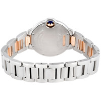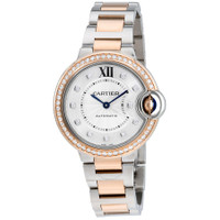 Silver-tone stainless steel case with a silver-tone stainless steel with 18kt rose gold bracelet. Fixed 18kt rose gold set with diamonds bezel. Silver dial with blued-steel sword-shaped hands and diamond hour markers. Roman numeral appears at the 12 o'clock positions. minute markers around an inner ring. Dial Type: Analog. Cartier Calibre 076 Automatic movement, based upon ETA 2670, containing 25 Jewels, bitting at 28800 vph, and has a power reserve of approximately 38 hours. Scratch resistant sapphire crystal. Pull / push crown. Solid case back. Round case shape, case size: 33 mm, case thickness: 9.96 mm. Band width: 19.05 mm, band length: 7.5 inches. Deployment clasp. Water resistant at 30 meters / 100 feet. Functions: hour, minute. Ballon Bleu De Cartier Series. Luxury watch style. Watch label: Swiss Made. Cartier Ballon Bleu Silver Diamond Dial Steel and Rose Gold Ladies Watch WE902077. INFORMATION Brand: Cartier Series: Ballon Bleu De Cartier Collection Name: Ballon Bleu de Cartier Gender: Womens Model: WE902077 Watch Label: Swiss Made Movement: Automatic Engine: Cartier Calibre 076 Power Reserve: 38 hours CASE Case Size: 33 mm Case Thickness: 9.96 mm Case Material: Stainless Steel Case Shape: Round Case Back: Solid BAND Band Material: Stainless Steel with 18kt Rose Gold Band Type: Bracelet Band Color: Silver-tone Band Length: 7.5 inches Band Width: 19.05 mm Clasp: Deployment DIAL Dial Color: Silver Type: Analog Crystal: Scratch Resistant Sapphire Hands: Blued-steel Sword-shaped Dial Markers: Diamond Second Markers: Roman Numeral appears at the 12 o'clock positions. Minute Markers around an inner ring Bezel: Fixed Bezel Material: 18kt Rose Gold set with Diamonds Crown: Pull / Push FEATURES Water Resistance: 30 meters / 100 feet Functions: Hour, Minute Watch Features: Diamond, Stainless Steel, Gold, Analog ADDITIONAL INFO Watch Style: Luxury Warranty: 2 Year Jomashop Warranty UPC Code: 7613268425923 Jomashop Sku: CRTWE902077 Department: Watches Category: Watches