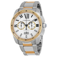 Stainless steel case with a stainless steel bracelet with 18kt pink gold links. Fixed 18kt pink gold bezel. Silver dial with luminous hands and Roman numeral and index hour markers. Dial Type: Analog. Luminescent hands. Date display at the 6 o'clock position. Chronograph - two sub-dials displaying: 12 hour and 30 minute. Cartier calibre 1904-CH MC automatic movement with a 48-hour power reserve. Scratch resistant sapphire crystal. Pull / push crown set with a faceted sapphire. Transparent case back. Round case shape. Case size: 42 mm. Case thickness: 12.6 mm. Band width: 22.9 mm. Deployment clasp. Water resistant at 100 meters / 330 feet. Functions: chronograph, column wheel, date, hour, minute, small second. Luxury watch style. Watch label: Swiss Made. Cartier Calibre de Cartier Chronograph Automatic Silver Dial Men's Watch W7100042. GENERAL Color: Gold / Pink / Silver / Skeleton INFORMATION Brand: Cartier Series: Calibre De Cartier Collection Name: Calibre de Cartier Gender: Mens Model: W7100042 Watch Label: Swiss Made Movement: Automatic Engine: Cartier Calibre 1904-CH MC Power Reserve: 48 hours CASE Case Size: 42 mm Case Thickness: 12.6 mm Case Material: Stainless Steel Case Shape: Round Case Back: Transparent BAND Band Material: Stainless Steel and 18kt Pink Gold Band Type: Bracelet Band Width: 22.9 mm Clasp: Deployment DIAL Dial Color: Silver Type: Analog Crystal: Scratch Resistant Sapphire Hands: Luminous Dial Markers: Roman Numeral and Index Sub Dials: Two - 12 Hour and 30 Minute Luminiscence: Hands Bezel: Fixed Bezel Material: 18kt Pink Gold Crown: Pull / Push set with a Faceted Sapphire FEATURES Water Resistance: 100 meters / 330 feet Calendar: Date display at the 6 o'clock position Functions: Chronograph, Column Wheel, Date, Hour, Minute, Small Second Watch Features: Chronograph, Stainless Steel, Gold, Analog ADDITIONAL INFO Watch Style: Luxury Warranty: 2 Year Jomashop Warranty UPC Code: 7613268267233 Jomashop Sku: CRTW7100042 Department: Watches Category: Watches
