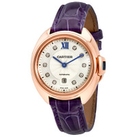 18kt rose gold case with a aubergine (alligator) leather strap. Fixed 18kt rose gold bezel. Flinque sunray dial with blued-steel sword-shaped hands and diamond hour markers. A Roman numeral appears at the 12 o'clock position. minute markers around the outer rim. Dial Type: Analog. Date display at the 6 o'clock position. Cartier Calibre 1847 MC Automatic movement, containing 23 Jewels, bitting at 28800 vph, and has a power reserve of approximately 42 hours. Scratch resistant sapphire crystal. Cabochon crown. Solid case back. Cushion case shape. Case size: 31 mm. Case thickness: 11.04 mm. Tang clasp. Water resistant at 30 meters / 100 feet. Functions: date, hour, minute, second. Cle Series. Luxury watch style. Watch label: Swiss Made. Cartier Cle 18kt Rose Gold Automatic Flinque Sunray Dial Ladies Watch WJCL0031. INFORMATION Brand: Cartier Series: Cle Collection Name: Cle Gender: Womens Model: WJCL0031 Watch Label: Swiss Made Movement: Automatic Engine: Cartier Calibre 1847 MC Power Reserve: 42 hours CASE Case Size: 31 mm Case Thickness: 11.04 mm Case Material: 18kt Rose Gold Case Shape: Cushion Case Back: Solid BAND Band Material: (Alligator) Leather Band Type: Strap Band Color: Aubergine Clasp: Tang DIAL Dial Color: Flinqué Sunray Type: Analog Crystal: Scratch Resistant Sapphire Hands: Blued-steel Sword-shaped Dial Markers: Diamond Second Markers: Roman Numeral appears at the 12 o'clock position. Minute Markers around the outer rim Bezel: Fixed Bezel Material: 18kt Rose Gold Crown: Cabochon FEATURES Water Resistance: 30 meters / 100 feet Calendar: Date display at the 6 o'clock position Functions: Date, Hour, Minute, Second Watch Features: Diamond, Leather, Gold, Analog, Alligator Leather ADDITIONAL INFO Watch Style: Luxury Warranty: 2 Year Jomashop Warranty UPC Code: 7613268660287 Jomashop Sku: CRTWJCL0031 Department: Watches Category: Watches