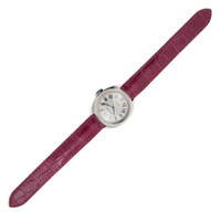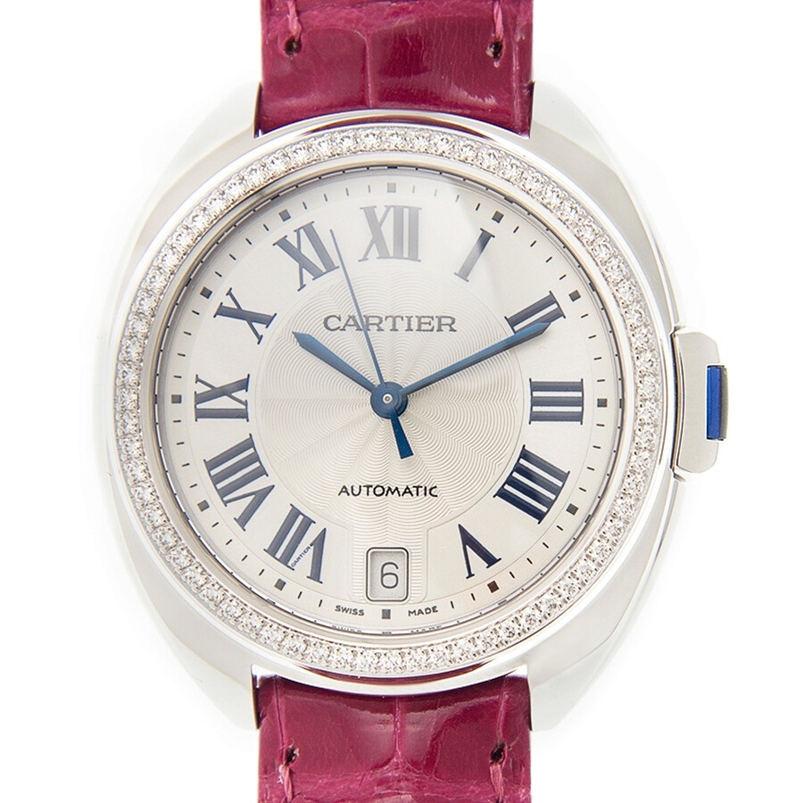 18kt white gold case with a fuchsia pink alligator leather strap. Diamond set fixed 18kt white gold diamond set bezel. Flinque dial with blued-steel sword-shaped hands and black Roman numeral hour markers. Minute markers around the outer rim. Dial Type: Analog. Date display at the 6 o'clock position. Cartier Calibre 1847 MC Automatic movement, containing 23 Jewels, bitting at 28800 vph, and has a power reserve of approximately 42 hours. Scratch resistant sapphire crystal. Cabochon crown. Cushion case shape, case size: 40 mm, case thickness: 11.76 mm. Tang clasp. Water resistant at 30 meters / 100 feet. Functions: date, hour, minute, second. Cle Series. Luxury watch style. Watch label: Swiss Made. Cartier Cle Automatic Diamond Ladies Watch WJCL0011. INFORMATION Brand: Cartier Series: Cle Collection Name: Cle Gender: Womens Model: WJCL0011 Watch Label: Swiss Made Movement: Automatic Engine: Cartier Calibre 1847 MC Power Reserve: 42 hours CASE Case Size: 40 mm Case Thickness: 11.76 mm Case Material: 18kt White Gold Case Shape: Cushion BAND Band Material: Fuchsia Pink Alligator Leather Band Type: Strap Band Color: Pink Clasp: Tang DIAL Dial Color: Flinque Type: Analog Crystal: Scratch Resistant Sapphire Hands: Blued-steel Sword-shaped Dial Markers: Black Roman Numeral Second Markers: Minute Markers around the outer rim Bezel: Diamond Set Fixed Bezel Color: 18kt White Gold Bezel Material: Diamond Set Crown: Cabochon FEATURES Water Resistance: 30 meters / 100 feet Calendar: Date display at the 6 o'clock position Functions: Date, Hour, Minute, Second Watch Features: Diamond, Leather, Gold, Analog, Alligator Leather ADDITIONAL INFO Watch Style: Luxury Warranty: 2 Year Jomashop Warranty Jomashop Sku: CRTWJCL0011 Department: Watches Category: Watches