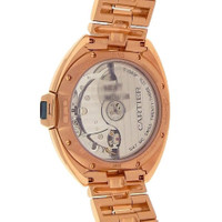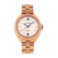 18kt rose gold case with a rose gold-tone 18kt rose gold bracelet. Fixed 18kt rose gold bezel. Flinque sunray dial with blued-steel sword-shaped hands and diamonds hour markers. Dial Type: Analog. Date display at the 6 o'clock position. Cartier Calibre 1847 MC Automatic movement, containing 23 Jewels, bitting at 28800 vph, and has a power reserve of approximately 42 hours. Scratch resistant sapphire crystal. Cabochon crown. Cushion case shape, case size: 35 mm. Water resistant at 30 meters / 100 feet. Functions: date, hour, minute, second. Cle Series. Luxury watch style. Watch label: Swiss Made. Cartier Cle Automatic Ladies Watch WJCL0033. INFORMATION Brand: Cartier Series: Cle Collection Name: Cle Gender: Womens Model: WJCL0033 Watch Label: Swiss Made Movement: Automatic Engine: Cartier Calibre 1847 MC Power Reserve: 42 hours CASE Case Size: 35 mm Case Material: 18kt Rose Gold Case Shape: Cushion BAND Band Material: 18kt Rose Gold Band Type: Bracelet Band Color: Rose Gold-tone DIAL Dial Color: Flinqué Sunray Type: Analog Crystal: Scratch Resistant Sapphire Hands: Blued-steel Sword-shaped Dial Markers: Diamonds Bezel: Fixed Bezel Material: 18kt Rose Gold Crown: Cabochon FEATURES Water Resistance: 30 meters / 100 feet Calendar: Date display at the 6 o'clock position Functions: Date, Hour, Minute, Second Watch Features: Diamond, Gold, Analog ADDITIONAL INFO Watch Style: Luxury Warranty: 2 Year Jomashop Warranty Jomashop Sku: CRTWJCL0033 Department: Watches Category: Watches