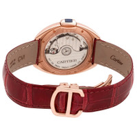 18kt pink gold set with diamonds case with a red bordeaux alligator leather strap. Fixed 18kt pink gold diamond set bezel. Flinque dial with blued-steel sword-shaped hands and black Roman numeral hour markers. Minute markers around the outer rim. Dial Type: Analog. Date display at the 6 o'clock position. Cartier Calibre 1847 MC Automatic movement, containing 23 Jewels, bitting at 28800 vph, and has a power reserve of approximately 42 hours. Scratch resistant sapphire crystal. Cabochon crown. Skeleton transparent exhibition see through case back. Cushion case shape, case size: 35 mm, case thickness: 10.09 mm. Double adjustable fold over clasp. Water resistant at 30 meters / 100 feet. Functions: date, hour, minute, second. Cle Series. Luxury watch style. Watch label: Swiss Made. Cartier Cle Flinque Dial Ladies Watch WJCL0013. INFORMATION Brand: Cartier Series: Cle Collection Name: Cle Gender: Womens Model: WJCL0013 Watch Label: Swiss Made Movement: Automatic Engine: Cartier Calibre 1847 MC Power Reserve: 42 hours CASE Case Size: 35 mm Case Thickness: 10.09 mm Case Material: 18kt Pink Gold Set with Diamonds Case Shape: Cushion Case Back: Skeleton Transparent Exhibition See Through BAND Band Material: Bordeaux Alligator Leather Band Type: Strap Band Color: Red Clasp: Double Adjustable Fold Over DIAL Dial Color: Flinque Type: Analog Crystal: Scratch Resistant Sapphire Hands: Blued-steel Sword-shaped Dial Markers: Black Roman Numeral Second Markers: Minute Markers around the outer rim Bezel: Fixed Bezel Color: 18kt Pink Gold Bezel Material: Diamond Set Crown: Cabochon FEATURES Water Resistance: 30 meters / 100 feet Calendar: Date display at the 6 o'clock position Functions: Date, Hour, Minute, Second Watch Features: Diamond, Leather, Gold, Analog, Alligator Leather ADDITIONAL INFO Watch Style: Luxury Warranty: 2 Year Jomashop Warranty Jomashop Sku: CRTWJCL0013 Department: Watches Category: Watches