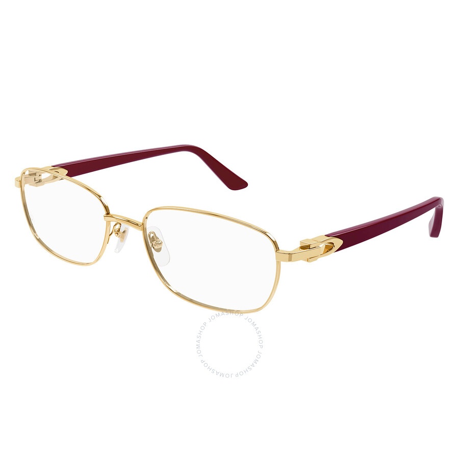 Cartier Eyeglasses. Series number: CT0368O. Color code: 003. Shape: Rectangular. Lens Width: 52 mm. Lens Bridge: 18 mm. Arm Length: 140 mm. Frame Material: Metal. Frame Color: Gold/Burgundy. Lenses Type: Demo. Rim Style: Full-Rim. UPC/EAN code: 843023159450. Cartier Demo Rectangular Ladies Eyeglasses CT0368O 003 52. Manufacturer's Packaging Included. Packaging Size And Color May Vary. GENERAL Frame Color: Gold/Burgundy INFORMATION Brand: Cartier Gender: Womens Model: CT0368O 003 52 DETAILS Series Number: CT0368O Color Code: 003 Lens: Demo Size: 52 mm Lens Width (mm): 52 Lens Bridge (mm): 18 Arm Length (mm): 140 mm Rim Style: Full-Rim Frame Shape: Rectangular Frame Material: Not Specified ADDITIONAL INFO UPC Code: 843023159450 Jomashop Sku: Z-F5W3P Department: Eyeglasses Category: Eyeglass Frames