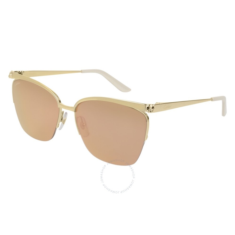 Cartier Sunglasses. Series Panthere de Cartier. Series number: CT0124S. Color code: 002. Shape: Cat Eye. Lens Width: 59 mm. Lens Bridge: 16 mm. Arm Length: 140 mm. 100% UV protection. Non-Polarized. Frame Material: Metal. Frame Color: Gold. Lenses Type: Pink. Rim Style: Semi-Rimless. UPC/EAN code: 843023106973. Cartier Panthere de Cartier Pink Cat Eye Ladies Sunglasses CT0124S 002 59. Manufacturer's Packaging Included. Packaging Size And Color May Vary. DETAILS Lens Width (mm): 59 Arm Length (mm): 140 mm Lens Bridge (mm): 16 Series Number: CT0124S Frame Color: Gold Color Code: 002 Lens: Pink UV Protection: 100% UV Protection Rim Style: Semi-Rimless Frame Shape: Cat Eye Frame Material: Not Specified GENERAL Size: 59 mm Collection Name: Panthere de Cartier INFORMATION Brand: Cartier Series: Panthere De Cartier Gender: Womens Model: CT0124S 002 59 ADDITIONAL INFO UPC Code: 843023106973 Jomashop Sku: Z-HMX9K Department: Sunglasses