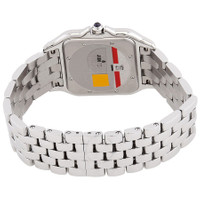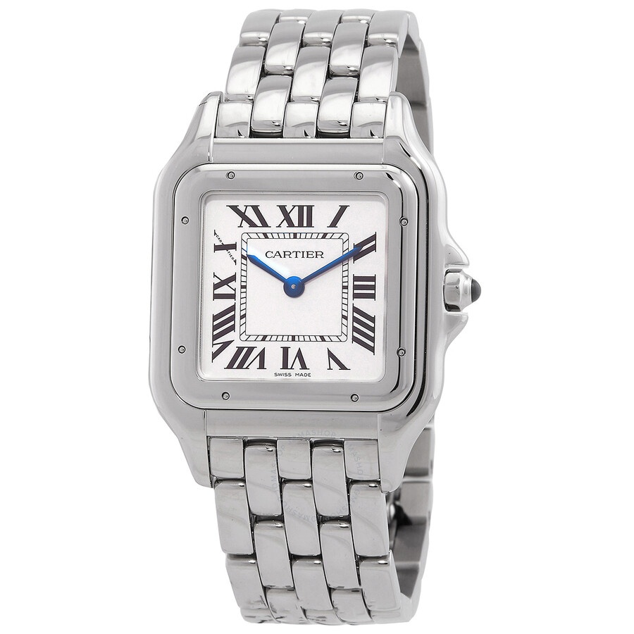Silver-tone stainless steel case and bracelet. Fixed silver-tone stainless steel bezel. Silver dial with blued-steel sword-shaped hands and Roman numeral hour markers. Minute scale around the inner rim. Dial Type: Analog. Quartz movement. Scratch resistant sapphire crystal. Cabochon crown. Square case shape, case size: 31 mm. Fold over clasp with a safety release. Water resistant at 30 meters / 100 feet. Functions: hour, minute. Panthere De Cartier Series. Luxury watch style. Watch label: Swiss Made. Cartier Panthere De Cartier Quartz Silver Dial Ladies Watch WSPN0011. CASE Case Size: 31 Case Material: Stainless Steel Case Shape: Square BAND Band Material: Stainless Steel Band Type: Bracelet Band Color: Silver-tone Clasp: Fold Over with Safety Release DIAL Dial Color: Silver Type: Analog Crystal: Scratch Resistant Sapphire Hands: Blued-steel Sword-shaped Dial Markers: Roman Numeral Second Markers: Minute Scale around the inner rim Bezel: Fixed Bezel Color: Silver-tone Bezel Material: Stainless Steel Crown: Cabochon INFORMATION Brand: Cartier Series: Panthere Collection Name: Panthere De Cartier Gender: Womens Model: WSPN0011 Watch Label: Swiss Made Movement: Quartz FEATURES Water Resistance: 30 meters / 100 feet Functions: Hour, Minute Watch Features: Stainless Steel, Analog ADDITIONAL INFO Watch Style: Luxury Warranty: 2 Year Jomashop Warranty Jomashop Sku: CRTWSPN0011 Department: Watches