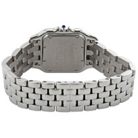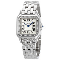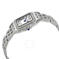 Stainless steel case with a stainless steel bracelet. Fixed stainless steel bezel set with diamonds. Silver dial with blued-steel sword-shaped hands and Roman numeral hour markers. Minute markers around an inner ring. Dial Type: Analog. Quartz movement. Scratch resistant sapphire crystal. Pull / push crown set with a synthetic blue spinel. Solid case back. Square case shape. Case dimensions: 27 mm x 37 mm. Case thickness: 6 mm. Hidden fold over clasp. Water resistant at 30 meters / 100 feet. Functions: hour, minute. Additional Info: crown set with a synthetic blue spinel. Luxury watch style. Watch label: Swiss Made. Cartier Panthere Medium Diamond Silver Dial Ladies Watch W4PN0008. INFORMATION Brand: Cartier Series: Panthere Collection Name: Panthere Gender: Womens Model: W4PN0008 Watch Label: Swiss Made Movement: Quartz CASE Case Size: 27 mm x 37 mm Case Thickness: 6 mm Case Material: Stainless Steel Case Shape: Square Case Back: Solid BAND Band Material: Stainless Steel Band Type: Bracelet Band Color: Silver-tone Clasp: Hidden Fold Over DIAL Dial Color: Silver Type: Analog Crystal: Scratch Resistant Sapphire Hands: Blued-steel Sword-shaped Dial Markers: Roman Numeral Second Markers: Minute Markers around an inner ring Bezel: Fixed Bezel Color: Silver-tone Bezel Material: Stainless Steel set with Diamonds Crown: Pull / Push FEATURES Water Resistance: 30 meters / 100 feet Functions: Hour, Minute Watch Features: Diamond, Stainless Steel, Analog ADDITIONAL INFO Watch Style: Luxury Warranty: 2 Year Jomashop Warranty UPC Code: 7613268919576 Additional Info: crown set with a synthetic blue spinel Jomashop Sku: CRTW4PN0008 Department: Watches Category: Watches