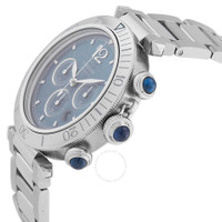 Silver-tone stainless steel case and bracelet. Silver-tone stainless steel bezel. Blue dial with silver-tone hands and index hour markers. Minute markers around the outer rim. Dial Type: Analog. Date display between 4 and 5 o'clock position. Chronograph - three sub-dials displaying: 60 second, 30 minute and 12 hour. Cartier Calibre 1904-CH3 MC automatic movement. Scratch resistant sapphire crystal. Transparent see through case back. Round case shape, case size: 41 mm. Fold over clasp with a safety release. Water resistant at 100 meters / 330 feet. Functions: chronograph, date, hour, minute, second. Additional Info: original box, international warranty card, manual (complete accessories). Pasha De Cartier Series. Luxury watch style. Watch label: Swiss Made. Cartier Pasha De Cartier Chronograph Automatic Blue Dial Men's Watch WSPA0039. CASE Case Size: 41 Case Material: Stainless Steel Case Shape: Round Case Back: Transparent See Through BAND Band Material: Stainless Steel Band Type: Bracelet Band Color: Silver-tone Clasp: Fold Over with Safety Release DIAL Dial Color: Blue Type: Analog Crystal: Scratch Resistant Sapphire Hands: Silver-tone Dial Markers: Index Second Markers: Minute Markers around the outer rim Sub Dials: Three - 60 Second, 30 Minute and 12 Hour Bezel Color: Silver-tone Bezel Material: Stainless Steel INFORMATION Brand: Cartier Series: Pasha Collection Name: Pasha Gender: Mens Model: WSPA0039 Watch Label: Swiss Made Movement: Automatic Engine: Cartier Calibre 1904-CH3 MC FEATURES Water Resistance: 100 meters / 330 feet Calendar: Date display between 4 and 5 o'clock position Functions: Chronograph, Date, Hour, Minute, Second Watch Features: Chronograph, Stainless Steel, Analog ADDITIONAL INFO Watch Style: Luxury Warranty: 2 Year Jomashop Warranty Additional Info: Original Box, Manual (Complete Accessories) Jomashop Sku: CRTWSPA0039 Department: Watches