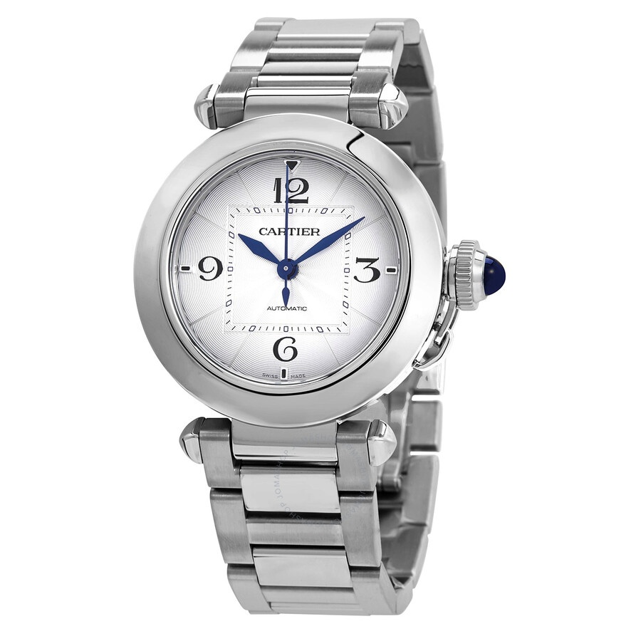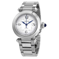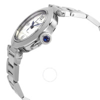 Silver-tone stainless steel case and bracelet. Fixed silver-tone stainless steel bezel. Silver dial with blue hands and index hour markers. Arabic numerals appear at the 3, 6, 9 and 12 o'clock positions. Minute markers around an inner ring. Dial Type: Analog. Luminescent markers. Cartier Calibre 1847 MC Automatic movement, containing 23 Jewels, bitting at 28800 vph, and has a power reserve of approximately 42 hours. Scratch resistant sapphire crystal. Screw down crown. Transparent case back. Round case shape, case size: 35 mm, case thickness: 9.37 mm. Deployment clasp. Water resistant at 100 meters / 330 feet. Functions: hour, minute, second. Pasha Series. Luxury watch style. Watch label: Swiss Made. Cartier Pasha Automatic Silver Dial Ladies Watch WSPA0013. INFORMATION Brand: Cartier Series: Pasha Collection Name: Pasha Gender: Womens Model: WSPA0013 Watch Label: Swiss Made Movement: Automatic Engine: Cartier Calibre 1847 MC Power Reserve: 42 hours CASE Case Size: 35 mm Case Thickness: 9.37 mm Case Material: Stainless Steel Case Shape: Round Case Back: Transparent BAND Band Material: Stainless Steel Band Type: Bracelet Band Color: Silver-tone Clasp: Deployment DIAL Dial Color: Silver Type: Analog Crystal: Scratch Resistant Sapphire Hands: Blue Dial Markers: Index Second Markers: Arabic Numerals appear at the 3, 6, 9 and 12 o'clock positions. Minute Markers around an inner ring Luminiscence: Markers Bezel: Fixed Bezel Color: Silver-tone Bezel Material: Stainless Steel Crown: Screw Down FEATURES Water Resistance: 100 meters / 330 feet Functions: Hour, Minute, Second Watch Features: Stainless Steel, Analog ADDITIONAL INFO Watch Style: Luxury Warranty: 2 Year Jomashop Warranty UPC Code: 7613375357278 Jomashop Sku: CRTWSPA0013 Department: Watches Category: Watches