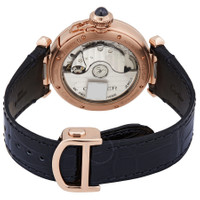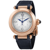 18kt rose gold case with a blue (alligator) leather strap. Fixed 18kt rose gold bezel. Silver flinque dial with blue hands and index hour markers. Arabic numerals appear at the 3, 6, 9 and 12 o'clock positions. Minute markers around an inner ring. Dial Type: Analog. Cartier calibre 1847 MC automatic movement, containing 23 Jewels, bitting at 28800 vph, and has a power reserve of approximately 42 hours. Scratch resistant sapphire crystal. Fluted crown. Transparent case back. Round case shape. Case size: 35 mm. Case thickness: 9.37 mm. Deployment clasp. Water resistant at 100 meters / 330 feet. Functions: hour, minute, second. Additional Info: straps with "quickswitch" interchangeability system. Pasha De Cartier Series. Luxury watch style. Watch label: Swiss Made. Cartier Pasha de Cartier Automatic 18kt Rose Gold Ladies Watch WGPA0014. INFORMATION Brand: Cartier Series: Pasha De Cartier Collection Name: Pasha de Cartier Gender: Womens Model: WGPA0014 Watch Label: Swiss Made Movement: Automatic Engine: Cartier Calibre 1847 MC CASE Case Size: 35 mm Case Thickness: 9.37 mm Case Material: 18kt Rose Gold Case Shape: Round Case Back: Transparent BAND Band Material: (Alligator) Leather Band Type: Strap Band Color: Blue Clasp: Deployment DIAL Dial Color: Silver Flinqué Type: Analog Crystal: Scratch Resistant Sapphire Hands: Blue Dial Markers: Index Second Markers: Arabic Numerals appear at the 3, 6, 9 and 12 o'clock positions. Minute Markers around an inner ring Bezel: Fixed Bezel Material: 18kt Rose Gold Crown: Fluted FEATURES Water Resistance: 100 meters / 330 feet Functions: Hour, Minute, Second Watch Features: Leather, Gold, Analog, Alligator Leather ADDITIONAL INFO Watch Style: Luxury Warranty: 2 Year Jomashop Warranty UPC Code: 7613375358138 Additional Info: straps with "QuickSwitch" interchangeability system Jomashop Sku: CRTWGPA0014 Department: Watches Category: Watches