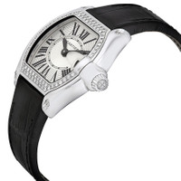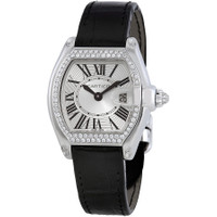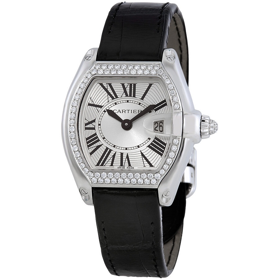 18kt white gold case set with round-cut diamonds. Black alligator strap. 18kt white gold crown set with a diamond. Silvered sunray effect dial. Magnified date displays at 3 o'clock position. Roman numeral hour markers. Sword-shaped blued steel hands. 18kt white gold adjustable deployant buckle. Quartz movement. Water resistant at 100 meters (330 feet). Sold with one interchangeable straps. Cartier Roadster 18kt White Gold Diamond Ladies Watch WE500260 GENERAL Color: Black / Gold / Silver / White INFORMATION Brand: Cartier Series: Roadster Collection Name: Roadster Gender: Womens Model: WE500260 Watch Label: Swiss Made Movement: Quartz Engine: Cartier Calibre 688 CASE Case Size: 37 mm x 32.8 mm Case Thickness: 8.9 mm Case Material: 18kt White Gold Case Shape: Tonneau Case Back: Solid BAND Band Material: Leather Band Type: Strap Band Color: Black Clasp: Deployment DIAL Dial Color: Silver Type: Analog Crystal: Scratch Resistant Sapphire Hands: Sword-shaped Dial Markers: Roman numeral Bezel: Fixed Bezel Material: Diamond Set Crown: 18k white gold - Screw down FEATURES Water Resistance: 100 meters / 330 feet Calendar: Date display at the 3 o'clock position Functions: Date, Hour, Minute Watch Features: Diamond, Gold, Analog, Alligator Leather ADDITIONAL INFO Watch Style: Luxury Warranty: 2 Year Jomashop Warranty UPC Code: 7612456279164 Jomashop Sku: CRTWE500260 Item Variation: WE500260, Cartier-WE500260 Department: Watches Category: Watches