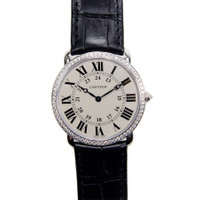 18 kt white gold case with a black alligator leather strap. Fixed 18 kt white gold diamond set bezel. Silver dial with blued-steel apple-shaped hands and black Roman numeral hour markers. Minute markers around an inner ring with 24 hour scale. Dial Type: Analog. Cartier Calibre 430 MC hand wind movement with a 40-hour power reserve. Scratch resistant sapphire crystal. Diamond set crown. Solid case back. Round case shape, case size: 36 mm, case thickness: 6.51 mm. Deployment with push button release clasp. Water resistant at 30 meters / 100 feet. Functions: GMT, second time zone, hour, minute. Luxury watch style. Watch label: Swiss Made. Cartier Ronde Louis Large Model Diamond Bezel Silver Dial 18 kt White Gold Ladies Watch WR000551. GENERAL Color: Black / Blue / Gold / Silver / White INFORMATION Brand: Cartier Series: Ronde Collection Name: Ronde Louis Cartier Gender: Womens Model: WR000551 Watch Label: Swiss Made Movement: Hand Wind Engine: Cartier Calibre 430 MC Power Reserve: 40 hours CASE Case Size: 36 mm Case Thickness: 6.51 mm Case Material: 18kt White Gold Case Shape: Round Case Back: Solid BAND Band Material: Alligator Leather Band Type: Strap Band Color: Black Clasp: Deployment with Push Button Release DIAL Dial Color: Silver Type: Analog Crystal: Scratch Resistant Sapphire Hands: Blued-steel Apple-shaped Dial Markers: Black Roman Numeral Second Markers: Minute Markers around an inner ring with 24 hour scale Bezel: Fixed Bezel Color: 18 kt White Gold Bezel Material: Diamond Set Crown: Diamond Set FEATURES Water Resistance: 30 meters / 100 feet Functions: GMT, Second Time Zone, Hour, Minute Watch Features: Alligator Leather, Analog, GMT, Gold, Leather, Diamond, Time Zone ADDITIONAL INFO Watch Style: Luxury Warranty: 2 Year Jomashop Warranty Jomashop Sku: CRTWR000551 Department: Watches Category: Watches
