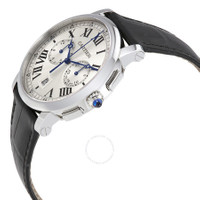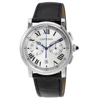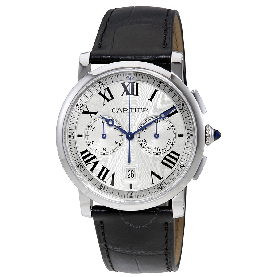 Stainless steel case with a black alligator leather strap. Fixed stainless steel bezel. Silver dial with blue hands and Roman numeral hour markers. Minute markers around the outer rim. Dial Type: Analog. Date display at the 6 o'clock position. Two sub-dials displaying: 12 hour and 30 minute. Automatic movement with a 48-hour power reserve. Scratch resistant sapphire crystal. Pull / push crown set wth a synthetic sapphire cabochon. Skeleton case back. Case diameter: 40 mm. Case thickness: 12.15 mm. Round case shape. Deployment clasp. Water resistant at 30 meters / 100 feet. Functions: chronograph, date, hour, minute, second. Luxury watch style. Watch label: Swiss Made. Cartier Rotonde Cartier Automatic Chronograph Silver Dial Black Leather Men's Watch WSRO0002. CASE Case Size: 40 Case Thickness: 12.15 mm Case Material: Stainless Steel Case Shape: Round Case Back: Skeleton BAND Band Material: Alligator Leather Band Type: Strap Band Color: Black Clasp: Deployment DIAL Dial Color: Silver Type: Analog Crystal: Scratch Resistant Sapphire Hands: Blue Dial Markers: Roman Numeral Second Markers: Minute Markers around the outer rim Sub Dials: Two - 12 Hour and 30 Minute Bezel: Fixed Bezel Color: Silver-tone Bezel Material: Stainless Steel Crown: Pull / Push set wth a Synthetic Sapphire Cabochon INFORMATION Brand: Cartier Series: Rotonde De Cartier Collection Name: Rotonde de Cartier Gender: Mens Model: WSRO0002 Watch Label: Swiss Made Movement: Automatic Engine: Cartier Calibre 1904-CH MC Power Reserve: 48 hours FEATURES Water Resistance: 30 meters / 100 feet Calendar: Date display at the 6 o'clock position Functions: Chronograph, Column Wheel, Date, Hour, Minute, Small Second Watch Features: Chronograph, Stainless Steel, Leather, Analog, Alligator Leather ADDITIONAL INFO Watch Style: Luxury Warranty: 2 Year Jomashop Warranty UPC Code: 7613268498705 Jomashop Sku: CRTWSRO0002 Department: Watches Category: Watches