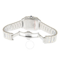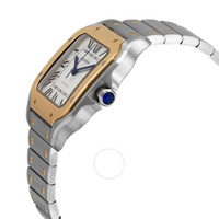 Stainless steel case with a stainless steel with 18kt yellow gold screws bracelet. Fixed 18kt yellow gold bezel. Silver dial with blued-steel sword-shaped hands and Roman numeral hour markers. Minute markers around an inner ring. Dial Type: Analog. Cartier Calibre 1847 MC Automatic movement, containing 23 Jewels, bitting at 28800 vph, and has a power reserve of approximately 42 hours. Scratch resistant sapphire crystal. Cabochon crown. Solid case back. Square case shape, case size: 35.1 mm, case thickness: 8.83 mm. Deployment with push button release clasp. Water resistant at 100 meters / 330 feet. Functions: hour, minute, second. Santos Series. Luxury watch style. Watch label: Swiss Made. Cartier Santos Automatic Silver Dial Watch W2SA0016. INFORMATION Brand: Cartier Series: Santos Collection Name: Santos Gender: Womens Model: W2SA0016 Watch Label: Swiss Made Movement: Automatic Engine: Cartier Calibre 1847 MC Power Reserve: 42 hours CASE Case Size: 35.1 mm Case Thickness: 8.83 mm Case Material: Stainless Steel Case Shape: Square Case Back: Solid BAND Band Material: Stainless Steel with 18kt Yellow Gold Screws Band Type: Bracelet Band Color: Two-tone (Silver-tone and Yellow Gold-tone) Clasp: Deployment with Push Button Release DIAL Dial Color: Silver Type: Analog Crystal: Scratch Resistant Sapphire Hands: Blued-steel Sword-shaped Dial Markers: Roman Numeral Second Markers: Minute Markers around an inner ring Bezel: Fixed Bezel Color: Yellow Gold-tone Bezel Material: 18kt Yellow Gold Crown: Cabochon FEATURES Water Resistance: 100 meters / 330 feet Functions: Hour, Minute, Second Watch Features: Stainless Steel, Gold, Analog ADDITIONAL INFO Watch Style: Luxury Warranty: 2 Year Jomashop Warranty Jomashop Sku: CRTW2SA0016 Department: Watches Category: Watches