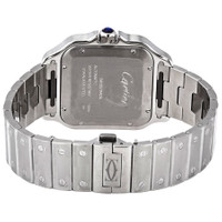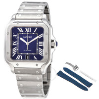Stainless steel case with a stainless steel bracelet. Fixed stainless steel bezel. Blue dial with silver-tone sword-shaped hands and silver-tone Roman numeral hour markers. Minute markers around an inner ring. Dial Type: Analog. Luminescent hands. Date display at the 6 o'clock position. Cartier calibre 1847 MC automatic movement, containing 23 Jewels, bitting at 28800 vph, and has a power reserve of approximately 42 hours. Scratch resistant sapphire crystal. Push / pull crown set with a faceted synthetic spinel cabochon. Solid case back. Square case shape. Case size: 39.8 mm. Case thickness: 9.08 mm. Deployment clasp. Water resistant at 100 meters / 330 feet. Functions: date, hour, minute, second. Additional Info: interchangeable calfskin leather strap. Santos De Cartier Series. Luxury watch style. Watch label: Swiss Made. Cartier Santos De Cartier Blue Dial Men's Watch WSSA0013. CASE Case Size: 39 Case Thickness: 9.08 mm Case Material: Stainless Steel Case Shape: Square Case Back: Solid BAND Band Material: Stainless Steel Band Type: Bracelet Band Color: Silver-tone Clasp: Deployment DIAL Dial Color: Blue Type: Analog Crystal: Scratch Resistant Sapphire Hands: Silver-tone Sword-shaped Dial Markers: Roman Numeral Second Markers: Minute Markers around an inner ring Luminiscence: Hands Bezel: Fixed Bezel Color: Silver-tone Bezel Material: Stainless Steel Crown: Push / Pull set with a Faceted Synthetic Spinel Ca INFORMATION Brand: Cartier Series: Santos De Cartier Collection Name: Santos De Cartier Gender: Mens Model: WSSA0013 Watch Label: Swiss Made Movement: Automatic Engine: Cartier Calibre 1847 MC Power Reserve: 42 hours FEATURES Water Resistance: 100 meters / 330 feet Calendar: Date display at the 6 o'clock position Functions: Date, Hour, Minute, Second Watch Features: Stainless Steel, Leather, Analog ADDITIONAL INFO Watch Style: Luxury Warranty: 2 Year Jomashop Warranty UPC Code: 7613375024927 Additional Info: Interchangeable calfskin leather strap Jomashop Sku: CRTWSSA0013 Department: Watches Category: Watches