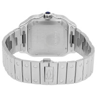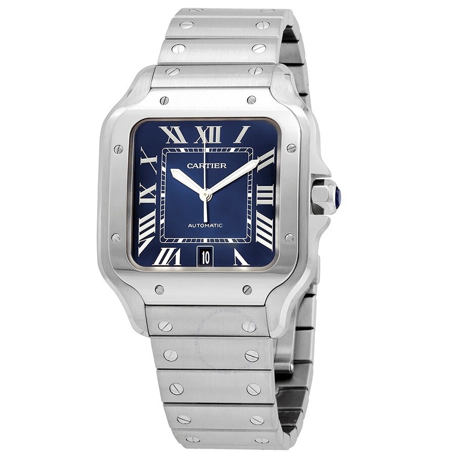 Stainless steel case with a stainless steel bracelet. Fixed stainless steel bezel. Blue dial with silver-tone sword-shaped hands and Roman numeral hour markers. Minute markers around an inner ring. Dial Type: Analog. Date display at the 6 o'clock position. Cartier calibre 1847 MC automatic movement, containing 23 Jewels, bitting at 28800 vph, and has a power reserve of approximately 42 hours. Scratch resistant sapphire crystal. Blue cabochoon crown. Solid case back. Square case shape. Case dimensions: 39.8 mm x 47.5 mm. Case thickness: 9.08 mm. Fold over clasp with a push button release. Water resistant at 100 meters / 330 feet. Functions: date, hour, minute, second. Santos Series. Luxury watch style. Watch label: Swiss Made. Cartier Santos De Cartier Blue Dial Men's Watch WSSA0030. CASE Case Size: 39 Case Thickness: 9.08 mm Case Material: Stainless Steel Case Shape: Square Case Back: Solid BAND Band Material: Stainless Steel Band Type: Bracelet Band Color: Silver-tone Clasp: Fold Over with Push Button Release DIAL Dial Color: Blue Type: Analog Crystal: Scratch Resistant Sapphire Hands: Silver-tone Sword-shaped Dial Markers: Roman Numeral Second Markers: Minute Markers around an inner ring Bezel: Fixed Bezel Color: Silver-tone Bezel Material: Stainless Steel Crown: Blue Cabochoon INFORMATION Brand: Cartier Series: Santos Collection Name: Santos Gender: Mens Model: WSSA0030 Watch Label: Swiss Made Movement: Automatic Engine: Cartier Calibre 1847 MC Power Reserve: 42 hours FEATURES Water Resistance: 100 meters / 330 feet Calendar: Date display at the 6 o'clock position Functions: Date, Hour, Minute, Second Watch Features: Stainless Steel, Analog ADDITIONAL INFO Watch Style: Luxury Warranty: 2 Year Jomashop Warranty UPC Code: 7613375257875 Jomashop Sku: CRTWSSA0030 Department: Watches Category: Watches