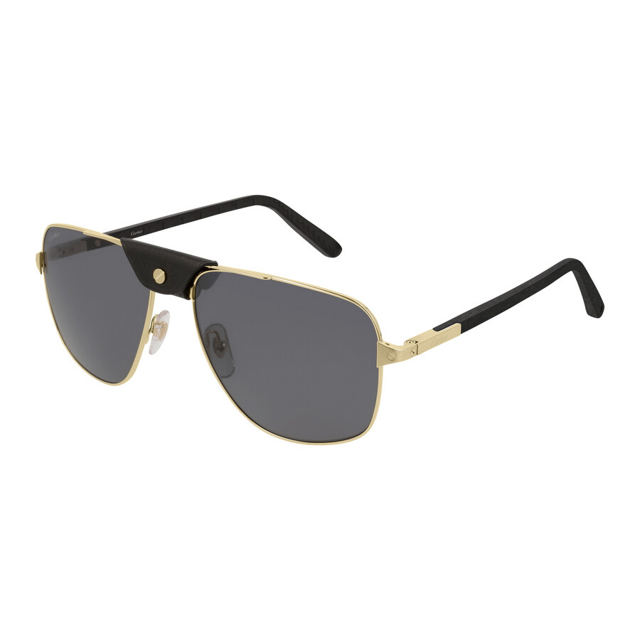 Cartier Sunglasses. Series Santos de Cartier. Series number: CT0097S. Color code: 001. Shape: Pilot. Lens Width: 59 mm. Lens Bridge: 16 mm. Arm Length: 140 mm. 100% UV protection. Polarized. Frame Material: Precious Metal. Frame Color: Gold with Grey Wood. Lenses Type: Polarized Grey. Rim Style: Full-Rim. UPC/EAN code: 843023105174. Cartier Santos de Cartier Polarized Grey Pilot Men's Sunglasses CT0097S 001 59. Manufacturer's Packaging Included. Packaging Size And Color May Vary. DETAILS Lens Width (mm): 59 Arm Length (mm): 140 mm Lens Bridge (mm): 16 Series Number: CT0097S Frame Color: Gold With Grey Wood Color Code: 001 Lens Type: Polarized Lens: Polarized Grey UV Protection: 100% UV Protection Rim Style: Full-Rim Frame Shape: Pilot Frame Material: Not Specified GENERAL Size: 59 mm Frame Color: Grey Lens Color: Grey Collection Name: Santos de Cartier INFORMATION Brand: Cartier Series: Santos De Cartier Gender: Mens Model: CT0097S 001 59 ADDITIONAL INFO UPC Code: 843023105174 Jomashop Sku: Z-L69E6 Department: Sunglasses