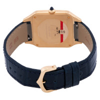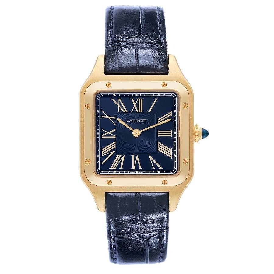 Yellow gold-tone 18kt yellow gold case with a blue alligator band. Fixed yellow gold-tone 18kt yellow gold bezel. Blue dial with yellow gold-tone hands and Roman numeral hour markers. Minute markers around the outer rim. Dial Type: Analog. Quartz movement. Scratch resistant sapphire crystal. Cabochon crown. Square case shape, case size: 31 mm. Functions: hour, minute. Additional Info: original box, international warranty card, manual (complete accessories). Santos-dumont Series. Luxury watch style. Watch label: Swiss Made. Cartier Santos-Dumont Quartz Blue Dial Ladies Watch WGSA0077. GENERAL Box Type: Original Box CASE Case Diameter: 31 mm Case Thickness: 7.3 mm Case Material: 18kt Yellow Gold Case Shape: Square BAND Band Material: Alligator Band Type: Strap Band Color: Blue DIAL Dial Color: Blue Type: Analog Crystal: Scratch Resistant Sapphire Hands: Yellow Gold-tone Dial Markers: Roman Numeral Second Markers: Minute Markers around the outer rim Bezel: Fixed Bezel Color: Yellow Gold-tone Bezel Material: 18kt Yellow Gold Crown: Cabochon INFORMATION Brand: Cartier Series: Santos Collection Name: Santos-Dumont Gender: Womens Model: WGSA0077 Watch Label: Swiss Made Movement: Quartz FEATURES Water Resistance: 30 meters / 100 feet Functions: Hour, Minute Watch Features: Alligator Leather, Analog, Gold ADDITIONAL INFO Watch Style: Luxury Warranty: 2 Year Jomashop Warranty Additional Info: Original Box, Manual (Complete Accessories) Jomashop Sku: CRTWGSA0077 Department: Watches
