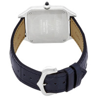 Stainless steel case with a blue (alligator) leather strap. Fixed stainless steel bezel. Silver dial with blued-steel sword-shaped hands and black Roman numeral hour markers. Minute markers around the outer rim. Dial Type: Analog. Quartz movement. Scratch resistant sapphire crystal. Cabochon crown. Solid case back. Rectangle case shape. Case dimensions: 43.5 mm x 31.4 mm. Case thickness: 7.3 mm. Fold over clasp. Water resistant at 30 meters / 100 feet. Functions: hour, minute. Additional Info: original box, manual (complete accessories). Santos-dumont Series. Luxury watch style. Watch label: Swiss Made. Cartier Santos-Dumont Quartz Silver Dial Men's Watch WSSA0022. CASE Case Size: 43 Case Thickness: 7.3 mm Case Material: Stainless Steel Case Shape: Rectangle Case Back: Solid BAND Band Material: (Alligator) Leather Band Type: Strap Band Color: Blue Clasp: Fold Over DIAL Dial Color: Silver Type: Analog Crystal: Scratch Resistant Sapphire Hands: Blued-steel Sword-shaped Dial Markers: Black Roman Numeral Second Markers: Minute Markers around the outer rim Bezel: Fixed Bezel Color: Silver-tone Bezel Material: Stainless Steel Crown: Cabochon INFORMATION Brand: Cartier Series: Santos-Dumont Collection Name: Santos-Dumont Gender: Mens Model: WSSA0022 Watch Label: Swiss Made Movement: Quartz FEATURES Water Resistance: 30 meters / 100 feet Functions: Hour, Minute Watch Features: Stainless Steel, Leather, Analog, Alligator Leather ADDITIONAL INFO Watch Style: Luxury Warranty: 2 Year Jomashop Warranty UPC Code: 7613375113430 Additional Info: Original Box, Manual (Complete Accessories) Jomashop Sku: CRTWSSA0022 Department: Watches Category: Watches