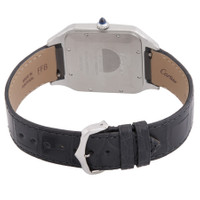 Silver-tone stainless steel case with a anthracite grey alligator leather strap. Fixed 18kt yellow gold bezel. Silver sunray dial with blue hands and Roman numeral hour markers. Minute markers around the outer rim. Dial Type: Analog. Cartier Calibre 430 hand wind movement with a 38-hour power reserve. Scratch resistant sapphire crystal. Pull / push crown. Solid case back. Square case shape, case size: 46.6 x 33.9 mm, case thickness: 7.5 mm. Buckle clasp. Water resistant at 30 meters / 100 feet. Functions: hour, minute. Santos-dumont Series. Luxury watch style. Watch label: Swiss Made. Cartier Santos-Dumont X-Large Model Hand Wind Men's Watch W2SA0034. GENERAL Box Type: Original Box CASE Case Thickness: 7.5 mm Case Material: Stainless Steel Case Shape: Square Case Back: Solid BAND Band Material: Alligator Leather Band Type: Strap Band Color: Anthracite Grey Clasp: Buckle DIAL Dial Color: Silver Sunray Type: Analog Crystal: Scratch Resistant Sapphire Hands: Blue Dial Markers: Roman Numeral Second Markers: Minute Markers around the outer rim Bezel: Fixed Bezel Material: 18kt Yellow Gold Crown: Pull / Push INFORMATION Brand: Cartier Series: Santos Collection Name: Santos-Dumont Gender: Mens Model: W2SA0034 Watch Label: Swiss Made Movement: Hand Wind Engine: Cartier Calibre 430 Power Reserve: 38 hours FEATURES Water Resistance: 30 meters / 100 feet Functions: Hour, Minute Watch Features: Alligator Leather, Analog, Gold, Leather, Stainless Steel ADDITIONAL INFO Watch Style: Luxury Warranty: 2 Year Jomashop Warranty Jomashop Sku: CRTW2SA0034 Department: Watches