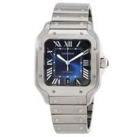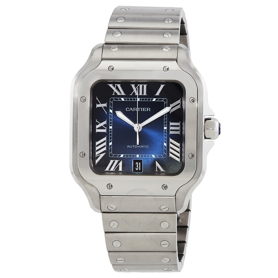 Silver-tone stainless steel case and bracelet. Fixed silver-tone stainless steel bezel. Blue dial with silver-tone hands and Roman numeral hour markers. Minute markers around an inner ring. Dial Type: Analog. Luminescent hands. Date display at the 6 o'clock position. Cartier Calibre 1847 MC Automatic movement, containing 23 Jewels, bitting at 28800 vph, and has a power reserve of approximately 42 hours. Scratch resistant sapphire crystal. Solid case back. Square case shape, case size: 39.8 mm, case thickness: 9.38 mm. Deployment clasp. Water resistant at 100 meters / 330 feet. Functions: date, hour, minute, second. Santos Series. Luxury watch style. Watch label: Swiss Made. Cartier Santos Large Model Automatic Blue Dial Men's Watch WSSA0071. CASE Case Size: 39 Case Thickness: 9.38 mm Case Material: Stainless Steel Case Shape: Square Case Back: Solid BAND Band Material: Stainless Steel Band Type: Bracelet Band Color: Silver-tone Clasp: Deployment DIAL Dial Color: Blue Type: Analog Crystal: Scratch Resistant Sapphire Hands: Silver-tone Dial Markers: Roman Numeral Second Markers: Minute Markers around an inner ring Luminiscence: Hands Bezel: Fixed Bezel Color: Silver-tone Bezel Material: Stainless Steel INFORMATION Brand: Cartier Series: Santos Collection Name: Santos Gender: Mens Model: WSSA0071 Watch Label: Swiss Made Movement: Automatic Engine: Cartier Calibre 1847 MC Power Reserve: 42 hours FEATURES Water Resistance: 100 meters / 330 feet Calendar: Date display at the 6 o'clock position Functions: Date, Hour, Minute, Second Watch Features: Stainless Steel, Analog ADDITIONAL INFO Watch Style: Luxury Warranty: 2 Year Jomashop Warranty Jomashop Sku: CRTWSSA0071 Department: Watches