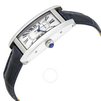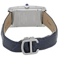 Stainless steel case with a navy blue (alligator) leather strap. Fixed stainless steel bezel. Silver dial with blued-steel sword-shaped hands and black Roman numeral hour markers. Minute markers around an inner ring. Dial Type: Analog. Automatic movement. Scratch resistant sapphire crystal. Octagonal with a synthetic blue spinel crown. Solid case back. Rectangle case shape. Case dimensions: 41.6 mm x 22.6 mm. Case thickness: 9.5 mm. Band width: 14 mm. Fold over clasp. Water resistant at 30 meters / 100 feet. Functions: hour, minute, second. Tank americaine series. Luxury watch style. Watch label: Swiss Made. Cartier Tank Americaine Automtic Silver Dial Ladies Watch WSTA0017. INFORMATION Brand: Cartier Series: Tank Americaine Collection Name: Tank Americaine Gender: Womens Model: WSTA0017 Watch Label: Swiss Made Movement: Automatic CASE Case Size: 41.6 mm x 22.6 mm Case Thickness: 9.5 mm Case Material: Stainless Steel Case Shape: Rectangle Case Back: Solid BAND Band Material: Alligator Leather Band Type: Strap Band Color: Navy Blue Band Width: 14 mm Clasp: Fold Over DIAL Dial Color: Silver Type: Analog Crystal: Scratch Resistant Sapphire Hands: Blued-steel Sword-shaped Dial Markers: Black Roman Numeral Second Markers: Minute Markers around an inner ring Bezel: Fixed Bezel Color: Silver-tone Bezel Material: Stainless Steel Crown: Octagonal with a synthetic blue spinel FEATURES Water Resistance: 30 meters / 100 feet Functions: Hour, Minute, Second Watch Features: Stainless Steel, Leather, Analog, Alligator Leather ADDITIONAL INFO Watch Style: Luxury Warranty: 2 Year Jomashop Warranty UPC Code: 7613268837672 Jomashop Sku: CRTWSTA0017 Department: Watches Category: Watches