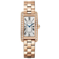 Rose gold-tone 18kt rose gold case and bracelet. Fixed rose gold-tone bezel with diamond set 18kt rose gold. Silver-tone dial with blued-steel sword-shaped hands and Roman numeral hour markers. Minute scale around the inner rim. Dial Type: Analog. Quartz movement. Scratch resistant sapphire crystal. Pull / push crown. Solid case back. Rectangle case shape, case size: 19.4 mm. Fold over clasp with a safety release. Water resistant at 30 meters / 100 feet. Functions: hour, minute. Tank Americaine Series. Luxury watch style. Watch label: Swiss Made. Cartier Tank Americaine Quartz Diamond Silver Dial Ladies Watch WJTA0044. CASE Case Size: 19 Case Material: 18kt Rose Gold Case Shape: Rectangle Case Back: Solid BAND Band Material: 18kt Rose Gold Band Type: Bracelet Band Color: Rose Gold-tone Clasp: Fold Over with Safety Release DIAL Dial Color: Silver-tone Type: Analog Crystal: Scratch Resistant Sapphire Hands: Blued-steel Sword-shaped Dial Markers: Roman Numeral Second Markers: Minute Scale around the inner rim Bezel: Fixed Bezel Color: Rose Gold-tone Bezel Material: Diamond Set 18kt Rose Gold Crown: Pull / Push INFORMATION Brand: Cartier Series: Tank Americaine Collection Name: Tank Americaine Gender: Womens Model: WJTA0044 Watch Label: Swiss Made Movement: Quartz FEATURES Water Resistance: 30 meters / 100 feet Functions: Hour, Minute Watch Features: Diamond, Gold, Analog ADDITIONAL INFO Watch Style: Luxury Warranty: 2 Year Jomashop Warranty Jomashop Sku: CRTWJTA0044 Department: Watches