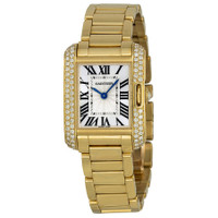 18kt yellow gold case with a 18kt yellow gold bracelet. Fixed set with diamonds bezel. Silver and lacquered flinque dial with blue sword shaped hands and Roman numeral hour markers. Minute markers around the inner rim. Dial Type: Analog. Quartz movement. Scratch resistant sapphire crystal. Case diameter: 30.2 x 22.7 mm. Rectangle case shape. Deployment with push button clasp. Water resistant at 30 meters / 100 feet. Functions: hour, minute. Luxury watch style. Watch label: Swiss Made. Cartier Tank Anglaise Silver dIAL 18kt Yellow Gold Ladies Watch WT100005. GENERAL Color: Blue / Gold / Silver / Tan / Yellow INFORMATION Brand: Cartier Series: Tank Anglaise Collection Name: Tank Anglaise Gender: Womens Model: WT100005 Watch Label: Swiss Made Movement: Quartz Engine: Cartier Calibre 057 CASE Case Size: 30.2 mm x 22.7 mm Case Material: 18kt Yellow Gold Case Shape: Rectangle BAND Band Material: 18kt Yellow Gold Band Type: Bracelet Band Color: Yellow Gold-tone Clasp: Deployment with Push Button Release DIAL Dial Color: Silver And Lacquered Flinque Type: Analog Crystal: Scratch Resistant Sapphire Hands: Blued-steel Sword-shaped Dial Markers: Roman Numeral Second Markers: Minute Markers around the inner rim Bezel: Fixed Bezel Material: Diamond Set FEATURES Water Resistance: 30 meters / 100 feet Functions: Hour, Minute Watch Features: Diamond, Gold, Analog ADDITIONAL INFO Watch Style: Luxury Warranty: 2 Year Jomashop Warranty UPC Code: 845960056175 Jomashop Sku: CRTWT100005 Department: Watches Category: Watches