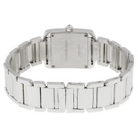 18kt white gold case and bracelet. Fixed 18kt white gold bezel set with 24 diamonds. Silver grained dial with sword-shaped blued steel hands and black Roman numeral hour markers. Minute markers around an inner ring. Quartz movement. Scratch resistant sapphire crystal. 18kt white gold octagonal crown set with a single diamond. Solid case back. Case dimensions: 25 mm x 20 mm. Case thickness: 6 mm. Hidden deployment clasp. Water resistant at 30 meters / 100 feet. Functions: hour and minute. Cartier Tank Francaise 18kt White Gold Diamond Ladies Watch WE1002S3. GENERAL Color: Black / Gold / Silver / Tan / White INFORMATION Brand: Cartier Series: Tank Francaise Collection Name: Tank Francaise Gender: Womens Model: WE1002S3 Watch Label: Swiss Made Movement: Quartz CASE Case Size: 25 mm x 20 mm Case Thickness: 6 mm Case Material: 18kt White Gold Case Shape: Square Case Back: Solid BAND Band Material: 18kt White Gold Band Type: Bracelet Band Color: White Gold-tone Clasp: Hidden Deployment DIAL Dial Color: Silver Grained Type: Analog Crystal: Scratch Resistant Sapphire Hands: Blued-steel Sword-shaped Dial Markers: Black Roman Numeral Second Markers: Minute Markers around an inner ring Bezel: Fixed 18kt White Gold set with 24 Diamonds Crown: 18kt White Gold Octagonal set with a Single Diamon FEATURES Water Resistance: 30 meters / 100 feet Functions: Hour and Minute Watch Features: Diamond, Gold, Analog ADDITIONAL INFO Watch Style: Luxury Warranty: 2 Year Jomashop Warranty UPC Code: 7612456137822 Jomashop Sku: CRTWE1002S3 Item Variation: WE1002S3, Cartier-WE1002S3 Department: Watches Category: Watches