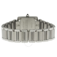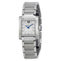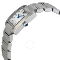 Stainless steel case with a stainless steel bracelet. Fixed stainless steel bezel. Silver dial with blue hands and diamond hour markers. A Roman numeral marks the 12 o'clock position. Minute markers around the inner ring. Dial Type: Analog. Quartz movement. Scratch resistant sapphire crystal. Pull / push crown. Solid case back. Case dimensions: 25.35 mm x 20.25 mm. Case thickness: 6 mm. Rectangle case shape. Hidden fold over clasp. Water resistant at 30 meters / 100 feet. Functions: hour, minute. Luxury watch style. Watch label: Swiss Made. Cartier Tank Francaise Silver Dial Stainless Steel Ladies Watch WE110006. INFORMATION Brand: Cartier Series: Tank Francaise Collection Name: Tank Francaise Gender: Womens Model: WE110006 Watch Label: Swiss Made Movement: Quartz Engine: Cartier Calibre 057 CASE Case Size: 25.35 mm x 20.25 mm Case Thickness: 6 mm Case Material: Stainless Steel Case Shape: Rectangle Case Back: Solid BAND Band Material: Stainless Steel Band Type: Bracelet Band Color: Silver-tone Clasp: Hidden Fold Over DIAL Dial Color: Silver Type: Analog Crystal: Scratch Resistant Sapphire Hands: Blued-steel Sword-shaped Dial Markers: Diamond Second Markers: Roman Numeral marks the 12 o'clock position. Minute Markers around the inner ring Bezel: Fixed Bezel Color: Silver-tone Bezel Material: Stainless Steel Crown: Pull / Push FEATURES Water Resistance: 30 meters / 100 feet Functions: Hour, Minute Watch Features: Diamond, Stainless Steel, Analog ADDITIONAL INFO Watch Style: Luxury Warranty: 2 Year Jomashop Warranty UPC Code: 7613268359402 Jomashop Sku: CRTWE110006 Department: Watches Category: Watches