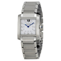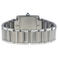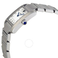 Stainless steel case with a stainless steel bracelet. Fixed stainless steel bezel. Silver dial with blue hands and diamond hour markers. A Roman numeral marks the 12 o'clock position. Minute markers around an inner ring. Dial Type: Analog. Quartz movement. Scratch resistant sapphire crystal. Push / pull crown, Solid case back. Case dimensions: 30.4 mm x 25.05 mm. Rectangle case shape. Folding clasp. Water resistant at 30 meters / 100 feet. Functions: hour, minute. Luxury watch style. Watch label: Swiss Made. Cartier Tank Francaise Silver Dial Stainless Steel Ladies Watch WE110007. INFORMATION Brand: Cartier Series: Tank Collection Name: Tank Francaise Gender: Womens Model: WE110007 Watch Label: Swiss Made Movement: Quartz Engine: Cartier Calibre 157 CASE Case Size: 30.4 mm x 25.05 mm Case Material: Stainless Steel Case Shape: Rectangle Case Back: Solid BAND Band Material: Stainless Steel Band Type: Bracelet Band Color: Silver-tone Clasp: Fold Over DIAL Dial Color: Silver Type: Analog Crystal: Scratch Resistant Sapphire Hands: Blued-steel Sword-shaped Dial Markers: Diamond Second Markers: Roman Numeral marks the 12 o'clock position. Minute Markers around the inner ring Bezel: Fixed Bezel Color: Silver-tone Bezel Material: Stainless Steel Crown: Pull / Push FEATURES Water Resistance: 30 meters / 100 feet Functions: Hour, Minute Watch Features: Diamond, Stainless Steel, Analog ADDITIONAL INFO Watch Style: Luxury Warranty: 2 Year Jomashop Warranty UPC Code: 7613268359419 Jomashop Sku: CRTWE110007 Department: Watches Category: Watches