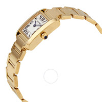 18kt yellow gold case with a 18kt yellow gold bracelet. Fixed 18kt yellow gold bezel. Silver-tone dial with blued-steel sword-shaped hands and Roman numeral hour markers. Minute markers around an inner ring. Dial Type: Analog. Quartz movement. Scratch resistant sapphire crystal. Screw down crown. Solid case back. Square case shape. Case dimensions: 25 mm x 20 mm. Case thickness: 6.15 mm. Hidden deployment clasp. Water resistant at 30 meters / 100 feet. Functions: hour, minute. Tank Française Series. Luxury watch style. Watch label: Swiss Made. Cartier Tank Française Small 18kt Yellow Gold Quartz Ladies Watch WGTA0031. INFORMATION Brand: Cartier Series: Tank Française Collection Name: Tank Française Gender: Womens Model: WGTA0031 Watch Label: Swiss Made Movement: Quartz CASE Case Size: 25 mm x 20 mm Case Thickness: 6.15 mm Case Material: 18kt Yellow Gold Case Shape: Square Case Back: Solid BAND Band Material: 18kt Yellow Gold Band Type: Bracelet Clasp: Hidden Deployment DIAL Dial Color: Silver-Tone Type: Analog Crystal: Scratch Resistant Sapphire Hands: Blued-steel Sword-shaped Dial Markers: Roman Numeral Second Markers: Minute Markers around an inner ring Bezel: Fixed Bezel Material: 18kt Yellow Gold Crown: Screw Down FEATURES Water Resistance: 30 meters / 100 feet Functions: Hour, Minute Watch Features: Gold, Analog ADDITIONAL INFO Watch Style: Luxury Warranty: 2 Year Jomashop Warranty UPC Code: 7613375112785 Jomashop Sku: CRTWGTA0031 Department: Watches Category: Watches