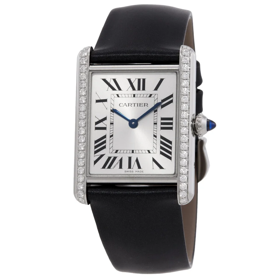 Silver-tone stainless steel case with a black leather strap. Fixed silver-tone bezel with diamond set stainless steel. Silver-tone dial with blued-steel sword-shaped hands and Roman numeral hour markers. Minute scale around the inner rim. Dial Type: Analog. Quartz movement. Scratch resistant sapphire crystal. Cabochon crown. Rectangle case shape, case size: 25 mm. Functions: hour, minute. Tank Series. Luxury watch style. Watch label: Swiss Made. Cartier Tank Quartz Diamond Silver Dial Ladies Watch W4TA0030. GENERAL Box Type: Original Box CASE Case Diameter: 25 mm Case Material: Stainless Steel Case Shape: Rectangle BAND Band Material: Leather Band Type: Strap Band Color: Black DIAL Dial Color: Silver-tone Type: Analog Crystal: Scratch Resistant Sapphire Hands: Blued-steel Sword-shaped Dial Markers: Roman Numeral Second Markers: Minute Scale around the inner rim Bezel: Fixed Bezel Color: Silver-tone Bezel Material: Diamond Set Stainless Steel Crown: Cabochon INFORMATION Brand: Cartier Series: Tank Collection Name: Tank Gender: Womens Model: W4TA0030 Watch Label: Swiss Made Movement: Quartz FEATURES Functions: Hour, Minute Watch Features: Analog, Leather, Stainless Steel, Diamond ADDITIONAL INFO Watch Style: Luxury Warranty: 2 Year Jomashop Warranty Jomashop Sku: CRTW4TA0030 Department: Watches