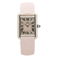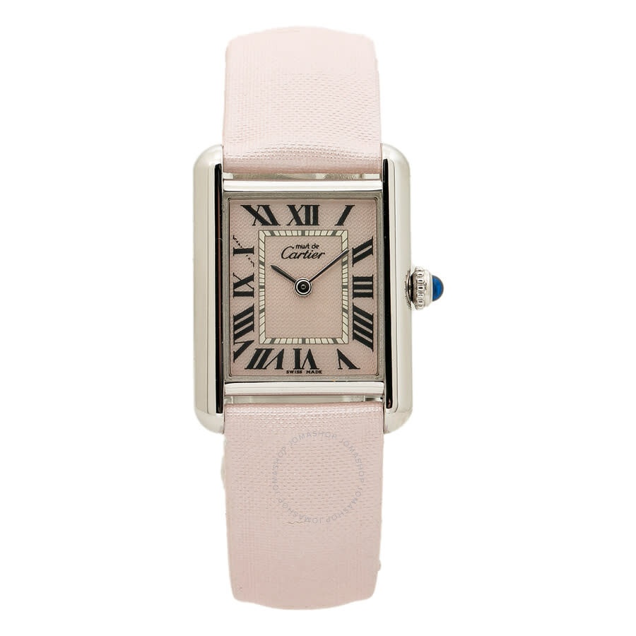 Silver-tone silver case with a pink satin strap. Fixed silver-tone 925 sterling silver bezel. Pink dial with Roman numeral hour markers. Dial Type: Analog. Quartz movement. Scratch resistant sapphire crystal. Pull / push crown. Solid case back. Rectangle case shape, case size: 22 mm, case thickness: 6 mm. Band width: 16 mm, band length: 6 inches. Fold over clasp. Functions: hour, minute. Tank Series. Luxury watch style. Watch label: Swiss Made. Cartier Tank Quartz Pink Dial Ladies Watch 2416. INFORMATION Brand: Cartier Series: Tank Collection Name: Tank Gender: Womens Model: 2416 Watch Label: Swiss Made Movement: Quartz CASE Case Size: 22 mm Case Thickness: 6 mm Case Material: Silver Case Shape: Rectangle Case Back: Solid BAND Band Material: Satin Band Type: Strap Band Color: Pink Band Length: 6 inches Band Width: 16 mm Clasp: Fold Over DIAL Dial Color: Pink Type: Analog Crystal: Scratch Resistant Sapphire Dial Markers: Roman Numeral Bezel: Fixed Bezel Color: Silver-tone Bezel Material: 925 Sterling Silver Crown: Pull / Push FEATURES Functions: Hour, Minute Watch Features: Analog ADDITIONAL INFO Watch Style: Luxury Warranty: 2 Year Jomashop Warranty Jomashop Sku: CRT2416 Department: Watches Category: Watches