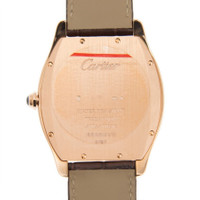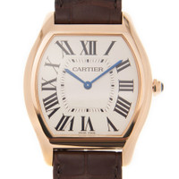 18k pink gold case with a brown alligator leather strap. Fixed bezel. Silver dial with blue-tone hands and Roman numeral hour markers. Minute markers around the outer rim. Dial Type: Analog. Hand wind movement. Scratch resistant sapphire crystal. Pull / push crown. Case diameter: 44.95 mm x 36.1 mm. Case thickness: 9.4 mm. Tonneau case shape. Water resistant at 30 meters / 100 feet. Functions: hour, minute. Luxury watch style. Watch label: Swiss Made. Cartier Tortue Silver Dial 18K Pink Gold Men's Large Watch WGTO0002. CASE Case Size: 44 Case Thickness: 9.4 mm Case Material: 18kt Pink Gold Case Shape: Tonneau BAND Band Material: Alligator Leather Band Type: Strap Band Color: Brown DIAL Dial Color: Silver Type: Analog Crystal: Scratch Resistant Sapphire Hands: Blued-steel Sword-shaped Dial Markers: Roman Numeral Second Markers: Minute Markers around the outer rim Bezel: Fixed Crown: Pull / Push INFORMATION Brand: Cartier Series: Tortue Collection Name: Tortue Gender: Mens Model: WGTO0002 Watch Label: Swiss Made Movement: Hand Wind Engine: Cartier Calibre 430 MC Power Reserve: 40 hours FEATURES Water Resistance: 30 meters / 100 feet Functions: Hour, Minute Watch Features: Leather, Gold, Analog, Alligator Leather ADDITIONAL INFO Watch Style: Luxury Warranty: 2 Year Jomashop Warranty Jomashop Sku: CRTWGTO0002 Department: Watches Category: Watches