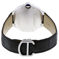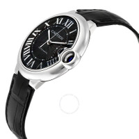 Pre-owned Silver-tone stainless steel case with a black crocodile leather strap. Fixed silver-tone stainless steel bezel. Black dial with silver-tone sword-shaped hands and Roman numeral hour markers. Minute markers around an inner ring. Dial Type: Analog. Date display at the 3 o'clock position. Cartier Calibre 1847 MC Automatic movement, containing 23 Jewels, bitting at 28800 vph, and has a power reserve of approximately 42 hours. Scratch resistant sapphire crystal. Pull / push crown. Solid case back. Round case shape, case size: 42.1 mm, case thickness: 13 mm. Double adjustable fold over clasp. Water resistant at 30 meters / 100 feet. Functions: date, hour, minute, second. Ballon Bleu De Cartier Series. Luxury watch style. Watch label: Swiss Made. Cartier Ballon Bleu de Cartier Automatic Men's Watch WSBB0003. GENERAL Collection Name: Ballon Bleu de Cartier INFORMATION Brand: Cartier Series: Ballon Bleu De Cartier Model: WSBB0003 Gender: Mens Watch Label: Swiss Made Movement: Automatic Engine: Cartier Calibre 1847 MC Power Reserve: 42 hours CONDITION INFORMATION Box: No Preowned Item Condition: Excellent Papers: No CASE Case Size: 42.1 mm Case Thickness: 13 mm Case Material: Stainless Steel Case Shape: Round Case Back: Solid DIAL Type: Analog Dial Color: Black Crystal: Scratch Resistant Sapphire Hands: Silver-tone Sword-shaped Second Markers: Minute Markers around an inner ring Dial Markers: Roman Numeral Bezel: Fixed Bezel Color: Silver-tone Bezel Material: Stainless Steel Crown: Pull / Push BAND Band Type: Strap Band Material: Crocodile Leather Band Color: Black Clasp: Double Adjustable Fold Over FEATURES Water Resistance: 30 meters / 100 feet Calendar: Date display at the 3 o'clock position Functions: Date, Hour, Minute, Second Watch Features: Stainless Steel, Leather, Analog ADDITIONAL INFO Watch Style: Luxury Warranty: 1 Year Jomashop Warranty UPC Code: 7613268440186 Jomashop Sku: PRE-P-CRT54009 Department: Watches Category: Watches
