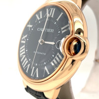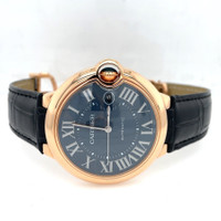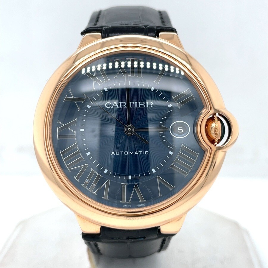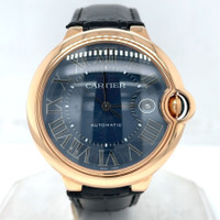 Rose gold-tone 18kt rose gold case with a black leather strap. Fixed rose gold-tone 18kt rose gold bezel. Blue dial with silver-tone hands and Roman numeral hour markers. Minute markers around an inner ring. Dial Type: Analog. Date display at the 3 o'clock position. Cartier Calibre 1847 MC Automatic movement, containing 23 Jewels, bitting at 28800 vph, and has a power reserve of approximately 42 hours. Scratch resistant sapphire crystal. Pull / push crown. Solid case back. Round case shape, case size: 42 mm, case thickness: 13 mm. Band width: 20 mm. Deployment with push button release clasp. Water resistant at 30 meters / 100 feet. Functions: date, hour, minute, second. Ballon Bleu De Cartier Series. Luxury watch style. Watch label: Swiss Made. Pre-owned Cartier Ballon Bleu de Cartier Blue Dial Men's Watch WGBB0036. GENERAL Collection Name: Ballon Bleu de Cartier INFORMATION Brand: Cartier Series: Ballon Bleu De Cartier Model: WGBB0036 Gender: Mens Watch Label: Swiss Made Movement: Automatic Engine: Cartier Calibre 1847 MC Power Reserve: 42 hours CONDITION INFORMATION Box: No Preowned Item Condition: Excellent Papers: Yes CASE Case Size: 42 mm Case Thickness: 13 mm Case Material: 18kt Rose Gold Case Shape: Round Case Back: Solid DIAL Type: Analog Dial Color: Blue Crystal: Scratch Resistant Sapphire Hands: Silver-tone Second Markers: Minute Markers around an inner ring Dial Markers: Roman Numeral Bezel: Fixed Bezel Color: Rose Gold-tone Bezel Material: 18kt Rose Gold Crown: Pull / Push BAND Band Type: Strap Band Material: Leather Band Color: Black Band Width: 20 mm Clasp: Deployment with Push Button Release FEATURES Water Resistance: 30 meters / 100 feet Calendar: Date display at the 3 o'clock position Functions: Date, Hour, Minute, Second Watch Features: Leather, Gold, Analog ADDITIONAL INFO Watch Style: Luxury Warranty: 1 Year Jomashop Warranty Jomashop Sku: PRE-P-CRT64338 Department: Watches Category: Watches