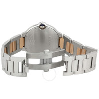 Pre-owned Stainless steel case with a stainless steel bracelet with 18kt rose gold center links. Fixed stainless steel bezel. Chocolate dial with rose gold-tone hands and Roman numeral hour markers. Minute markers around the inner ring. Dial Type: Analog. Date display at the 3 o'clock position. Automatic movement. Scratch resistant sapphire crystal. 18kt rose gold crown with synethic spinal cabochon. Solid case back. Case diameter: 42 mm. Case thickness: 13 mm. Band width: 20 mm. Deployment clasp. Water resistant at 30 meters (100 feet). Functions: hour, minute, second, date. Luxury watch style. Watch label: Swiss Made. Cartier Ballon Bleu de Cartier Gold and Steel Large Watch W6920032. GENERAL Collection Name: Ballon Bleu de Cartier INFORMATION Brand: Cartier Series: Ballon Bleu De Cartier Model: W6920032 Gender: Mens Watch Label: Swiss Made Movement: Automatic Engine: Cartier Calibre 049 Power Reserve: 42 hours CONDITION INFORMATION Box: No Preowned Item Condition: Excellent Papers: No CASE Case Size: 42 mm Case Thickness: 13 mm Case Material: Stainless Steel Case Shape: Round Case Back: Solid DIAL Type: Analog Dial Color: Chocolate Crystal: Scratch Resistant Sapphire Hands: Rose Gold-tone Second Markers: Minute Markers around the inner ring Dial Markers: Roman Numeral Bezel: Fixed Bezel Color: Silver-tone Bezel Material: Stainless Steel Crown: 18k Rose Gold with Synethic Spinal Cabochon BAND Band Type: Bracelet Band Material: Stainless Steel with 18kt Rose Gold center links Band Color: Silver-tone Band Width: 20 mm Clasp: Deployment FEATURES Water Resistance: 30 meters / 100 feet Calendar: Date display at the 3 o'clock position Functions: Date, Hour, Minute, Second Watch Features: Stainless Steel, Gold, Analog ADDITIONAL INFO Watch Style: Luxury Warranty: 1 Year Jomashop Warranty UPC Code: 7612456621017 Jomashop Sku: PRE-P-CRT44181 Department: Watches Category: Watches