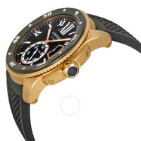 Pre-owned 18kt rose gold case with a black rubber strap. Uni-directional rotating coin edge 18kt rose gold bezel with a black ADLC top ring. Black dial with luminous rose gold-tone sword-shaped hands and index and Roman numeral hour markers. Minute markers around the outer rim. Dial Type: Analog. Luminescent hands and markers. Date display at the 3 o'clock position. Small second sub-dial at the 6 o'clock position. Cartier calibre 1904-PS MC Automatic movement, containing 27 Jewels, bitting at 28800 vph, and has a power reserve of approximately 48 hours. Scratch resistant sapphire crystal. Screw down crown. Solid case back. Round case shape. Case size: 42 mm. Case thickness: 11 mm. Tang clasp. Water resistant at 300 meters / 1000 feet. Functions: date, hour, minute, small second. Calibre De Cartier Diver Series. Dive watch style. Watch label: Swiss Made. Cartier Calibre de Cartier Diver Automatic Men's Watch W7100052. GENERAL Collection Name: Calibre de Cartier Diver INFORMATION Brand: Cartier Series: Calibre De Cartier Diver Model: W7100052 Gender: Mens Watch Label: Swiss Made Movement: Automatic Engine: Cartier Calibre 1904-PS MC Power Reserve: 48 hours CONDITION INFORMATION Box: No Preowned Item Condition: Excellent Papers: No CASE Case Size: 42 mm Case Thickness: 11 mm Case Material: 18kt Rose Gold Case Shape: Round Case Back: Solid DIAL Type: Analog Dial Color: Black Crystal: Scratch Resistant Sapphire Hands: Luminous Rose Gold-tone Sword-shaped Second Markers: Minute Markers around the outer rim Dial Markers: Index and Roman Numeral Sub Dials: Small Seconds Luminiscence: Hands and Markers Bezel: Uni-directional Rotating Coin Edge Bezel Material: 18kt Rose Gold with a Black ADLC Top Ring Crown: Screw Down BAND Band Type: Strap Band Material: Rubber Band Color: Black Clasp: Tang FEATURES Water Resistance: 300 meters / 1000 feet Calendar: Date display at the 3 o'clock position Functions: Date, Hour, Minute, Small Second Watch Features: Rubber, Gold, Analog ADDITIONAL INFO Watch Style: Dive Warranty: 1 Year Jomashop Warranty UPC Code: 7613268367353 Jomashop Sku: PRE-P-CRT61182 Department: Watches Category: Watches