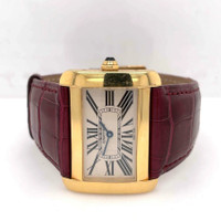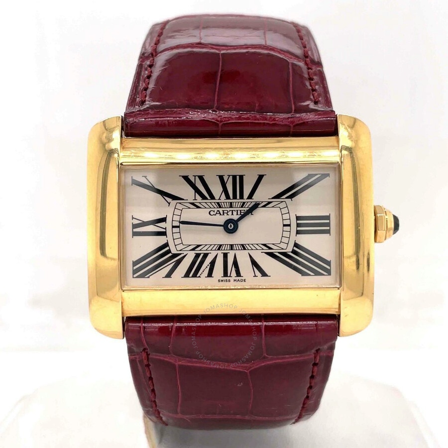 Pre-owned 18k yellow gold case with a brown alligator leather strap. Fixed bezel. Whtie dial with blue-toned hands and Roman numeral hour markers. Minute markers around the inner ring. Dial Type: Analog. Automatic movement. Scratch resistant sapphire crystal. Case diameter: 38 mm x 28 mm. Rectangle case shape. Water resistant at 30 meters / 100 feet. Functions: hour, minute, second. Luxury watch style. Watch label: Swiss Made. Cartier Divan White Dial 18K Yellow Gold Automatic Ladies Watch W6300856. GENERAL Collection Name: Divan INFORMATION Brand: Cartier Series: Divan Model: W6300856 Gender: Womens Watch Label: Swiss Made Movement: Automatic CONDITION INFORMATION Box: No Preowned Item Condition: Excellent Papers: No CASE Case Size: 38 mm x 28 mm Case Material: 18kt Yellow Gold Case Shape: Rectangle DIAL Type: Analog Dial Color: Whtie Crystal: Scratch Resistant Sapphire Hands: Blued-steel Sword-shaped Second Markers: Minute Markers around the inner ring Dial Markers: Roman Numeral Bezel: Fixed Bezel Color: Yellow Gold-tone Bezel Material: 18kt Yellow Gold BAND Band Type: Strap Band Material: Alligator Leather Band Color: Brown Clasp: Tang FEATURES Water Resistance: 30 meters / 100 feet Functions: Hour, Minute, Second Watch Features: Leather, Gold, Analog, Alligator Leather ADDITIONAL INFO Watch Style: Luxury Warranty: 1 Year Jomashop Warranty Additional Info: 38mm*** Jomashop Sku: PRE-P-CRT56664 Department: Watches Category: Watches