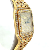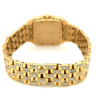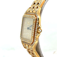 Yellow gold-tone diamond set 18kt yellow gold case and bracelet. Fixed yellow gold-tone bezel with diamond set 18kt yellow gold. Diamond dial with blued-steel sword-shaped hands and diamond hour markers. Dial Type: Analog. Quartz movement. Scratch resistant sapphire crystal. Pull / push crown. Solid case back. Square case shape, case size: 22 mm, case thickness: 6 mm. Band width: 15 mm. Hidden clasp. Water resistant at 30 meters / 100 feet. Functions: hour, minute. Panthere Series. Luxury watch style. Watch label: Swiss Made. Pre-owned Cartier Panthere Quartz Diamond Ladies Watch WF3072B9PVE. GENERAL Collection Name: Panthere INFORMATION Brand: Cartier Series: Panthere Model: WF3072B9PVE Gender: Womens Watch Label: Swiss Made Movement: Quartz CONDITION INFORMATION Box: No Preowned Item Condition: Excellent Papers: No CASE Case Size: 22 mm Case Thickness: 6 mm Case Material: Diamond Set 18kt Yellow Gold Case Shape: Square Case Back: Solid DIAL Type: Analog Dial Color: Diamond Crystal: Scratch Resistant Sapphire Hands: Blued-steel Sword-shaped Dial Markers: Diamond Bezel: Fixed Bezel Color: Yellow Gold-tone Bezel Material: Diamond Set 18kt Yellow Gold Crown: Pull / Push BAND Band Type: Bracelet Band Material: Diamond Set 18kt Yellow Gold Band Color: Yellow Gold-tone Band Width: 15 mm Clasp: Hidden FEATURES Water Resistance: 30 meters / 100 feet Functions: Hour, Minute Watch Features: Diamond, Gold, Analog ADDITIONAL INFO Watch Style: Luxury Warranty: 1 Year Jomashop Warranty Jomashop Sku: PRE-P-CRT75942 Department: Watches Category: Watches