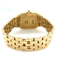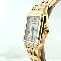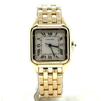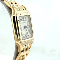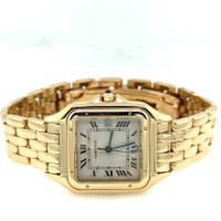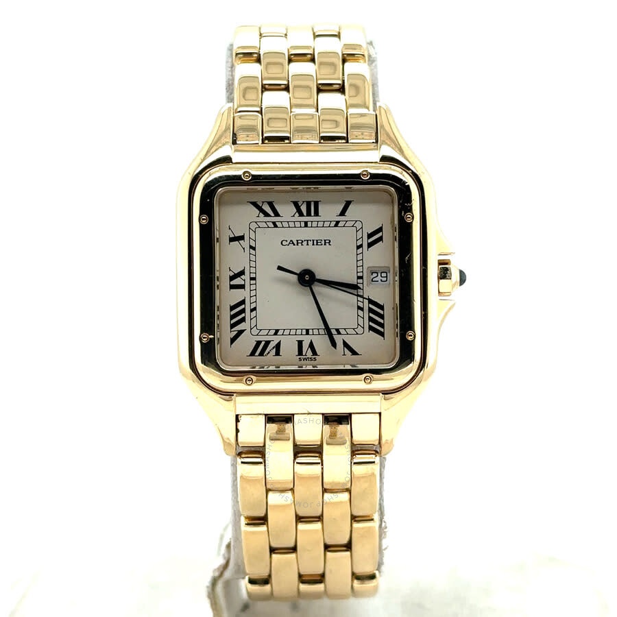 Yellow gold-tone 18kt yellow gold case and bracelet. Fixed yellow gold-tone 18kt yellow gold bezel. Beige dial with blued-steel sword-shaped hands and Roman numeral hour markers. Minute scale around the inner rim. Dial Type: Analog. Date display at the 3 o'clock position. Quartz movement. Scratch resistant sapphire crystal. Pull / push crown. Solid case back. Square case shape, case size: 29 mm, case thickness: 6 mm. Band width: 15 mm. Hidden clasp. Water resistant at 30 meters / 100 feet. Functions: date, hour, minute, second. Panthere Series. Luxury watch style. Watch label: Swiss Made. Pre-owned Cartier Panthere Quartz Ladies Watch 8839. GENERAL Collection Name: Panthere INFORMATION Brand: Cartier Series: Panthere Model: 8839 Gender: Womens Watch Label: Swiss Made Movement: Quartz CONDITION INFORMATION Box: No Preowned Item Condition: Excellent Papers: No CASE Case Size: 29 mm Case Thickness: 6 mm Case Material: 18kt Yellow Gold Case Shape: Square Case Back: Solid DIAL Type: Analog Dial Color: Beige Crystal: Scratch Resistant Sapphire Hands: Blued-steel Sword-shaped Second Markers: Minute Scale around the inner rim Dial Markers: Roman Numeral Bezel: Fixed Bezel Color: Yellow Gold-tone Bezel Material: 18kt Yellow Gold Crown: Pull / Push BAND Band Type: Bracelet Band Material: 18kt Yellow Gold Band Color: Yellow Gold-tone Band Width: 15 mm Clasp: Hidden FEATURES Water Resistance: 30 meters / 100 feet Calendar: Date display at the 3 o'clock position Functions: Date, Hour, Minute, Second Watch Features: Gold, Analog ADDITIONAL INFO Watch Style: Luxury Warranty: 1 Year Jomashop Warranty Jomashop Sku: PRE-P-CRT84246 Department: Watches