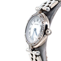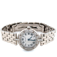 18kt white gold case and bracelet. Fixed bezel with diamond set 18kt white gold. Silver-tone dial with blued-steel sword-shaped hands and Roman numeral hour markers. Minute markers around the outer rim. Dial Type: Analog. Quartz movement. Scratch resistant sapphire crystal. Pull / push crown. Solid case back. Round case shape, case size: 22 mm, case thickness: 5.65 mm. Band width: 12 mm. Hidden clasp. Water resistant at 30 meters / 100 feet. Functions: hour, minute. Panthere Vendome Series. Luxury watch style. Watch label: Swiss Made. Pre-owned Cartier Panthere Vendome Quartz Diamond Silver Dial Ladies Watch 3057916. GENERAL Collection Name: Panthere Vendome INFORMATION Brand: Cartier Series: Panthere Vendome Model: 3057916 Gender: Womens Watch Label: Swiss Made Movement: Quartz CONDITION INFORMATION Box: No Preowned Item Condition: Excellent Papers: No Comments: FITS UP TO 6.5+ INCH WRIST AND WEIGHS 68.6 GRAMS CASE Case Thickness: 5.65 mm Case Material: 18kt White Gold Case Shape: Round Case Back: Solid DIAL Type: Analog Dial Color: Silver-tone Crystal: Scratch Resistant Sapphire Hands: Blued-steel Sword-shaped Second Markers: Minute Markers around the outer rim Dial Markers: Roman Numeral Bezel: Fixed Bezel Material: Diamond Set 18kt White Gold Crown: Pull / Push BAND Band Type: Bracelet Band Material: 18kt White Gold Band Width: 12 mm Clasp: Hidden FEATURES Water Resistance: 30 meters / 100 feet Functions: Hour, Minute Watch Features: Diamond, Gold, Analog ADDITIONAL INFO Watch Style: Luxury Warranty: 1 Year Jomashop Warranty Jomashop Sku: PRE-P-CRT99243 Department: Watches